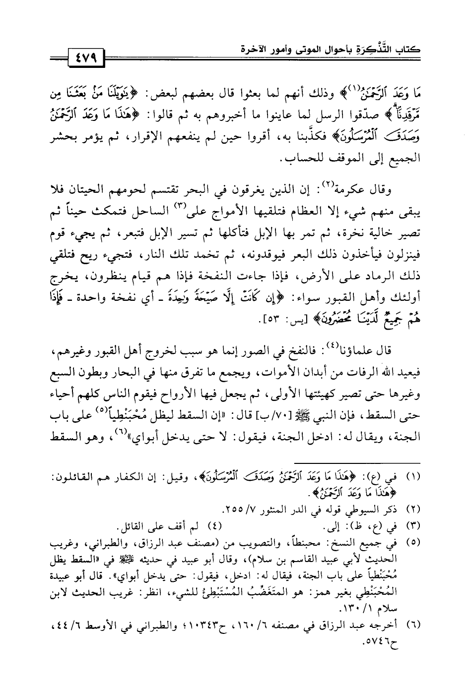 قال علماؤنا رحمهم الله: فالنفخ في الصور إنما هو سبب لخروج أهل القبور وغيرهم، فيعيد الله الرفات من أبدان الأموات، ويجمع ما تفرق منها في البحار وبطون السباع وغيرها، حتى تصير كهيئاتها الأولى، ثم يجعل فيها الأرواح فتقوم الناس كلهم أحياء حتى السقط، فإن النبي صلى الله عليه وسلم قال: «إن السقط ليظل محبنطئاً على باب الجنة.