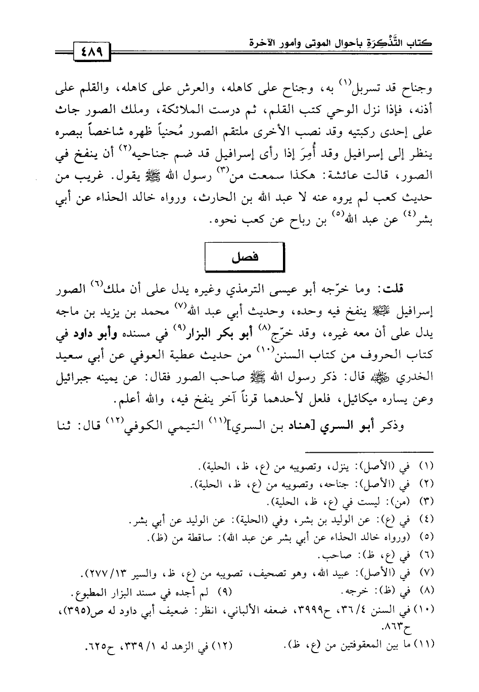 وقد خرج أبو بكر البزار في مسنده، وأبو داود في كتاب الحروف من كتاب السنن «من حديث عطية العوفي، عن أبي سعيد الخدري قال: ذكر رسول الله صلى الله عليه وسلم صاحب الصور فقال: عن يمينه جبريل، وعن يساره ميكائيل» فلعل لأحدهما قرناً آخر ينفخ فيه والله أعلم.