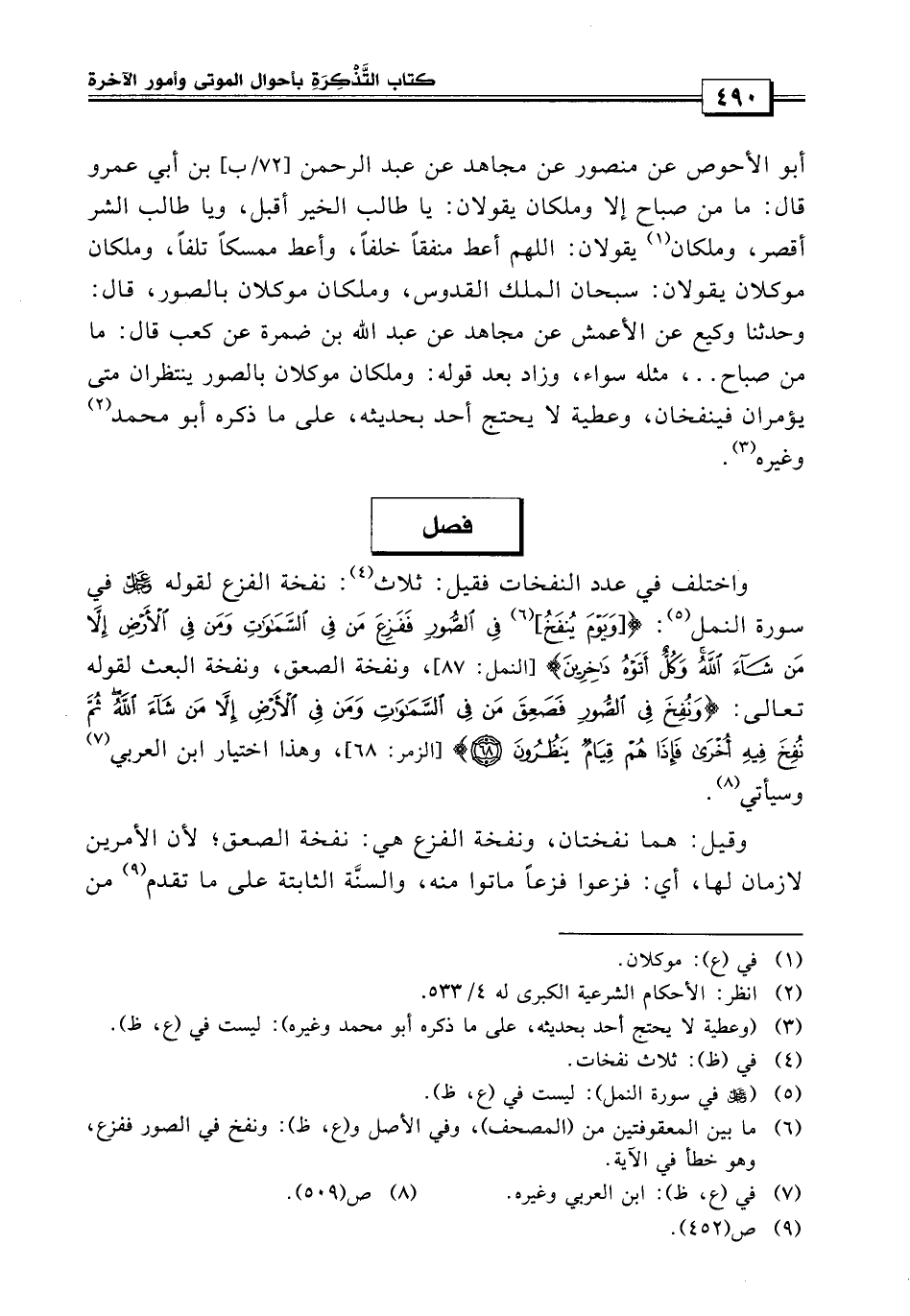 فصل: واختلف في عدد النفخات: فقيل ثلاث: نفخة الفزع لقوله تعالى {ويوم ينفخ في الصور ففزع من في السماوات ومن في الأرض إلا من شاء الله وكل أتوه داخرين} ونفخة الضعف ونفخة البعث، لقوله تعالى: {ونفخ في الصور فصعق من في السموات ومن في الأرض إلا من شاء الله، ثم نفخ فيه أخرى فإذا هم قيام ينظرون} وهذا اختيار ابن العربي وغيره.