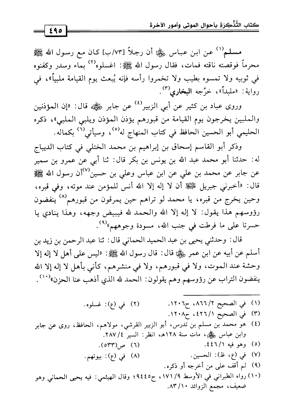 وهذا ينادي ياحسرتا على ما فرطت في جنب الله مسودة وجوههم» قال: «وحدثني يحيى بن عبد الحميد بن عبد الحماني، حدثنا عبد الرحمن بن يزيد بن أسلم، عن أبيه، عن ابن عمر قال: قال رسول الله صلى الله عليه وسلم: ليس على أهل لا إله إلا الله وحشة عند الموت ولا في قبورهم ولا منشرهم كأني بأهل لا إله إلا الله ينفضون التراب عن رؤوسهم وهم يقولون: الحمد لله الذي أذهب عنا الحزن» .