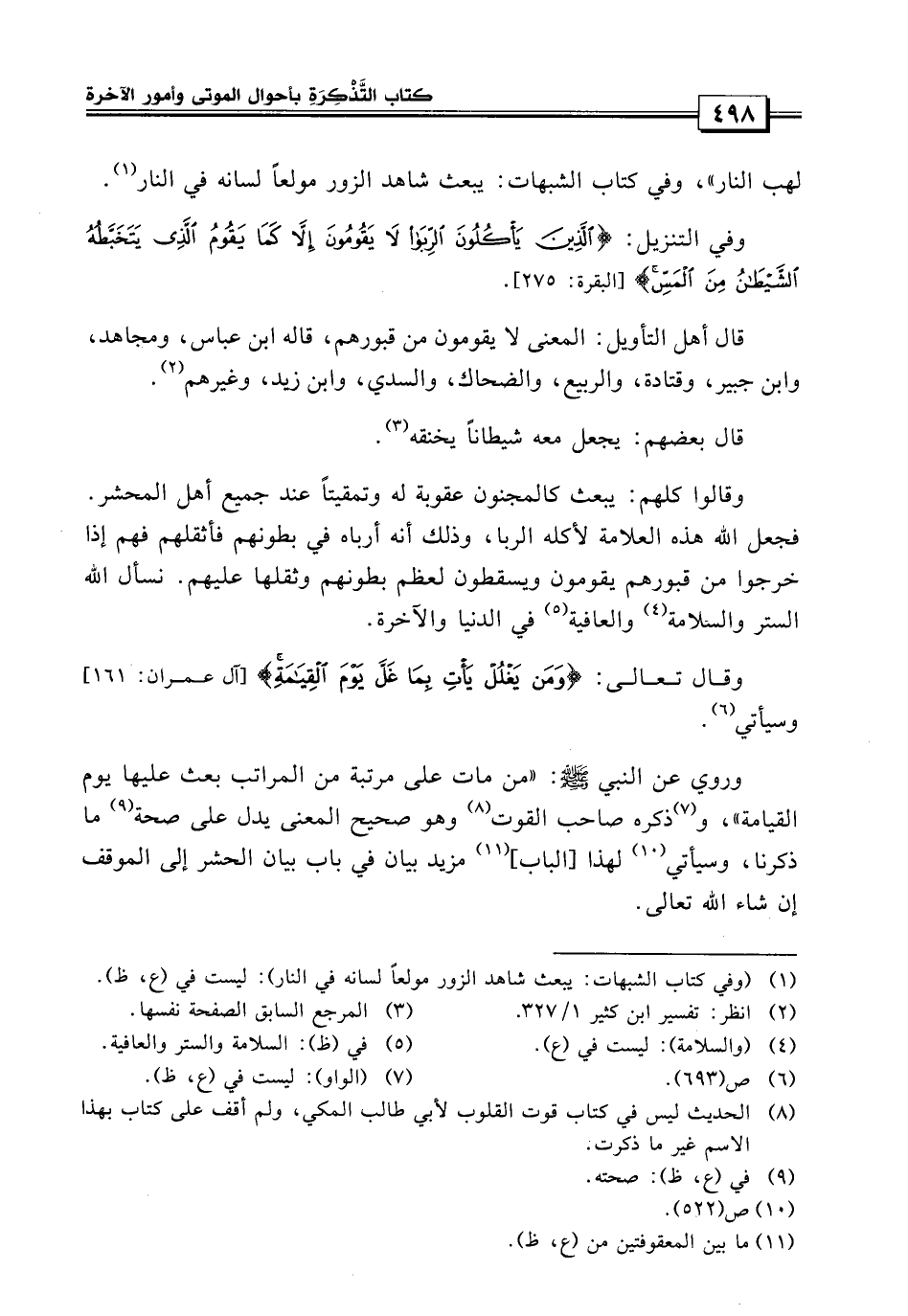 وروي عن النبي صلى الله عليه وسلم: «من مات على مرتبة من المراتب بعث عليها يوم القيامة» ذكره صاحب القوت وهو صحيح المعنى يدل على صجته ما ذكرناه وسياتي لهذا الباب مزيد بيان في باب بيان الحشر إلى الموقف إن شاء الله تعالى.