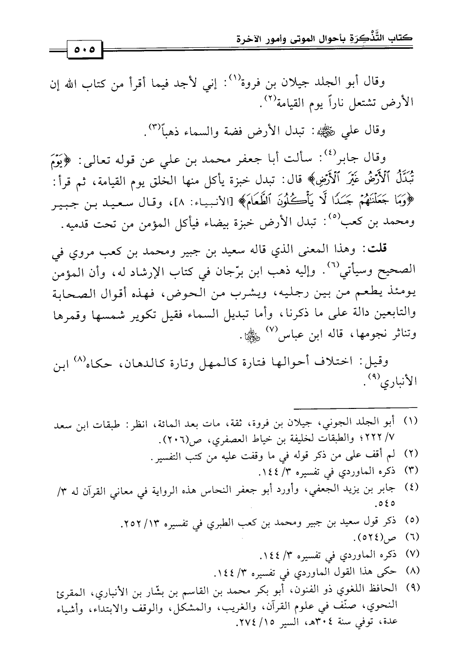 وقال علي رضي الله عنه: تبدل الأرض فضة، والسماء ذهباً، وقال جابر: سألت أبا جعفر محمد بن علي عن قول الله تعالى: {يوم تبدل الأرض غير الأرض} قال تبدل خبزة يأكل منها الخلق يوم القيامة.
