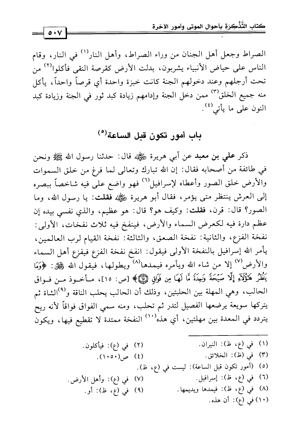 الصراط وجعل أهل الجنان من وراء الصراط، وأهل النيران في النار وقام الناس على حياض الأنبياء يشربون بدلت الأرض كقرصة النقي، فأكلوا من تحت أرجلهم، وعند دخولهم الجنة كانت خبزة واحدة أي قرصاً واحداً يأكل منه جميع الخلق ممن دخل الجنة وإدامهم زيادة كبد ثور في الجنة وزيادة كبد النون على ما يأتي.