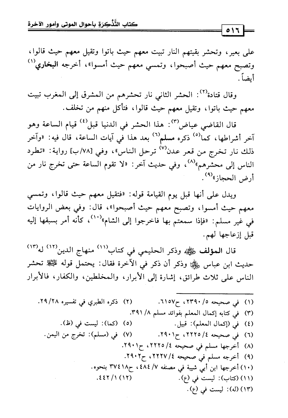 قال المؤلف رحمه الله: وذكر الحليمي في منهاج الدين له من حديث ابن عباس وذكر أن ذلك في الآخرة فقال: يحمتل قوله عليه السلام: «تحشر الناس على ثلاث طرائق» إشارة إلى الأبرار والمخلطين والكفار، فالأبرار