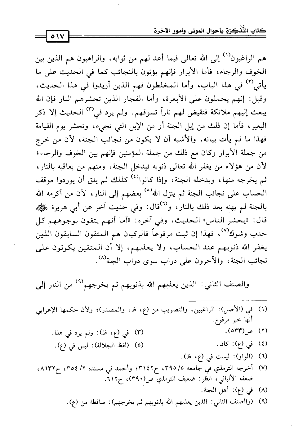 هم الراغبون إلى الله تعالى فيما أعد لهم من ثوابه، والراهبون هم الذين بين الخوف والرجاء، فأما الأبرار فإنهم يؤتون بالنجائب كما في الحديث على ما يأتي في هذا الباب، وأما المخلطون فهم الذين أرادوا في هذا الحديث، وقيل: إنهم يحملون على الأبعرة، وأما الفجار الذين تحشرهم النار فإن الله تعالى يبعث إليهم ملائكة فتقيض لهم ناراً تسوقهم ولم يرد في هذا الحديث إلا ذكر البعير، فأما أن ذلك من إبل الجنة أو من الإبل التي تحيا وتحشر يوم القيامة، فهذا لم يأت بيانه.