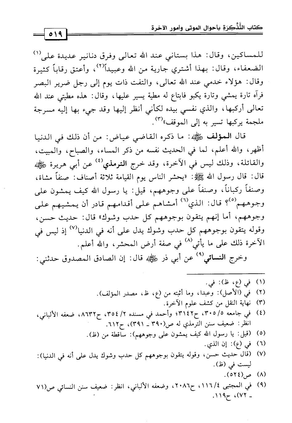 وقد احتج الترمذي «عن أبي هريرة رضي الله عنه قال: قال رسول الله صلى الله عليه وسلم: يحشر الناس يوم القيامة ثلاثة أصناف صنفاً مشاة وصنفاً ركباناً وصنفاً على وجوههم قيل يا رسول الله: كيف يمشون على وجوههم؟ قال: إن الذي أمشاهم على أقدامهم قادر أن يمشيهم على وجوههم أما أنهم يتقون بوجوههم كل حدب وشوك قال: هذا حديث حسن فقوله يتقون بوجوههم كل حدب وشوك يدل على أنه في الدنيا إذ ليس في الآخرة ذلك على ما يأتي من صفة أرض المحشر، والله أعلم.