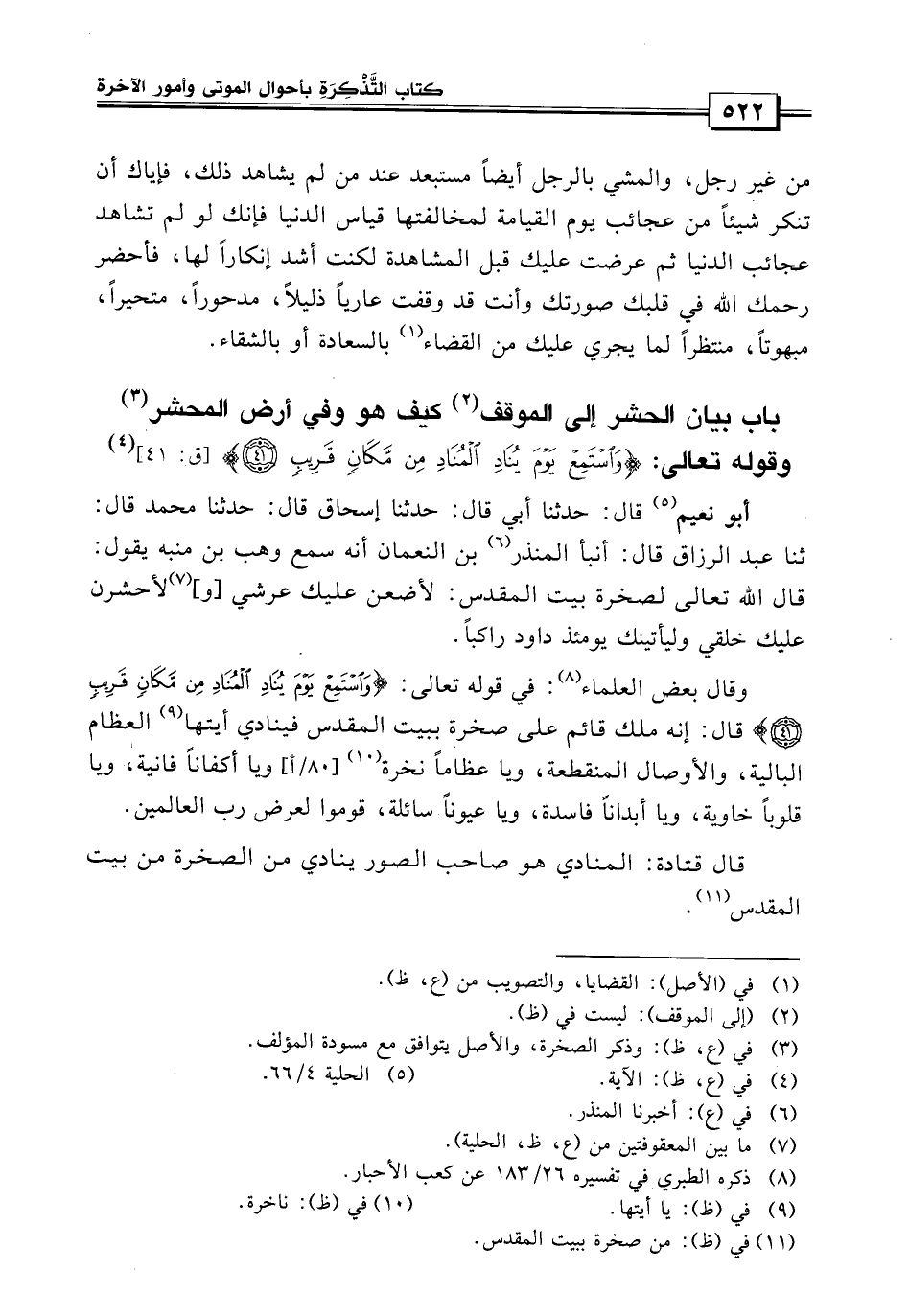 أبو نعيم قال، حدثنا أبي قال، حدثنا إسحاق قال، حدثنا محمد قال، قال حدثنا عبد الرزاق قال: أخبرنا المنذر النعمان أنه سمع وهب بن منبه يقول: قال الله تعالى لصخرة بيت المقدس: لأضعن عليك عرشي ولأحشرن عليك خلقي وليأتينك يومئذ داود راكباً وقال بعض العلماء في قوله تعالى: {واستمع يوم يناد المناد من مكان قريب} قال: إنه ملك قائم على صخرة بيت المقدس فينادي: أيتها العظام البالية، والأوصال المتقطعة، ويا عظاماً نخرة، ويا أكفاناً فانية، ويا قلوبا خلوية، ويا أبداناً فاسدة، ويا عيوناً سائلة قومواً لعرض رب العالمين.