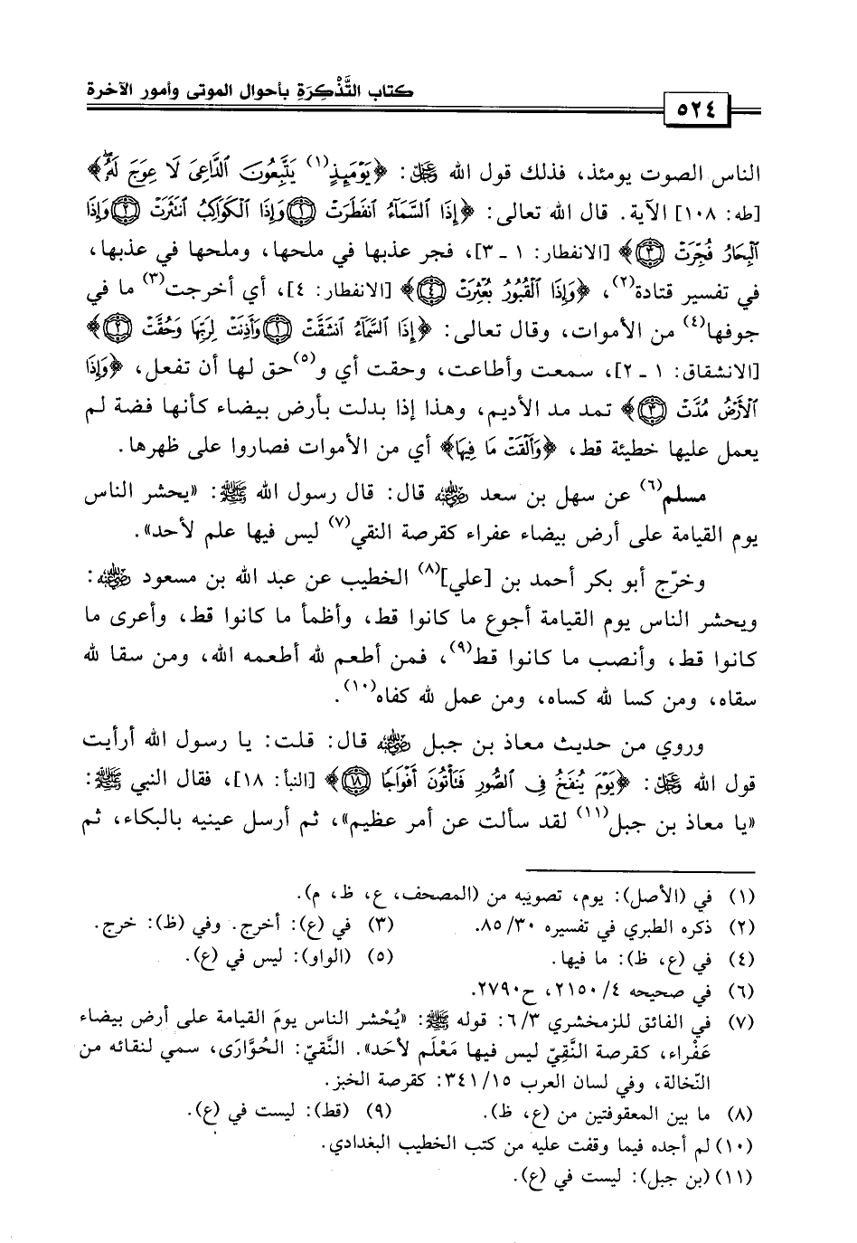 «وروي من حديث معاذ بن جبل قال: قلت يا رسول الله أرأيت قول الله {يوم ينفخ في الصور فتأتون أفواجاً} فقال النبي صلى الله عليه وسلم يا معاذ بن جبل لقد سألت عن أمر عظيم ثم أرسل عينيه بالبكاء الدموع، ثم