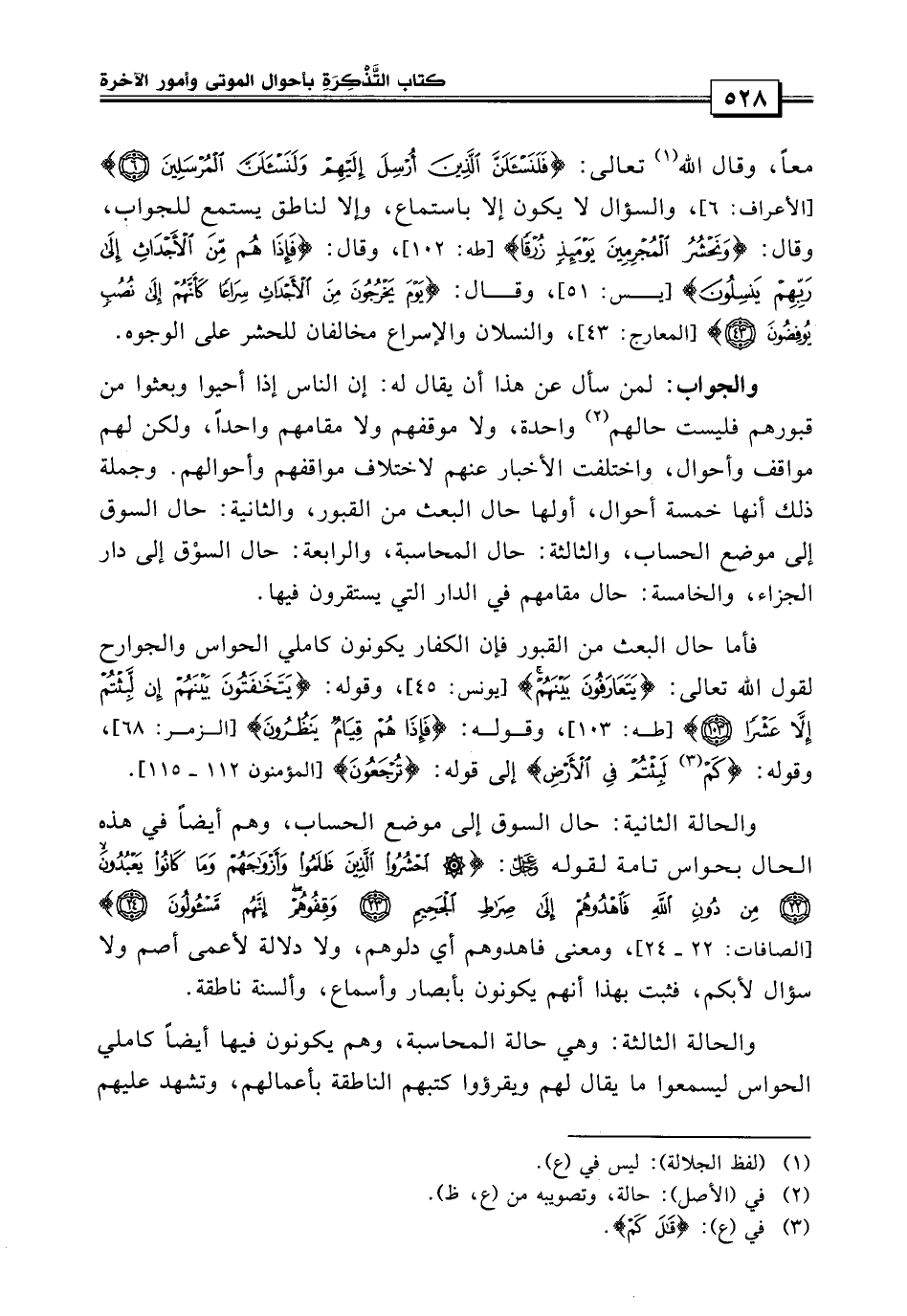 والحالة الثالثة: وهي حالة المحاسبة وهم يكونون فيها أيضاً كاملي الحواس ليسمعوا ما يقال لهم ويقرأوا كتبهم الناطقة بأعمالهم وتشهد عليهم