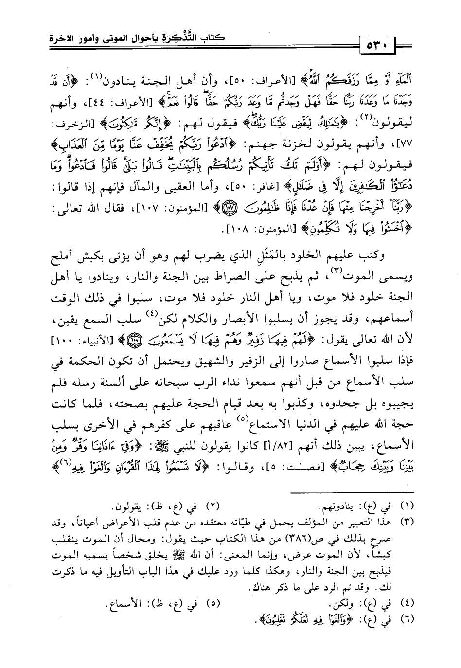 وأما العقبى والمال فإنهم إذا قالوا: {أخرجنا منها فإن عدنا فإنا ظالمون} فقال الله تعالى {اخسؤوا فيها ولا تكلمون} وكتب عليهم الخلود بالمثل الذي يضرب لهم وهو أن يؤتى بكبش أملح ويسمى المكوت، ثم يذبح على الصراط بين الجنة والنار وينادوا يا أهل الجنة خلود فلا موت، ويا أهل النار خلود فلا موت سلبوا في ذلك الوقت أسماعهم، وقد يجوز أن يسلبوا الأبصار والكلام، لكن سلب السمع يقين، لأن الله تعالى يقول: {لهم فيها زفير وهم فيها لا يسمعون} فإذا سلبوا الأسماع صاروا إلى الزفير والشهيق، ويحتمل أن تكون الحكمة في سلب الأسماع من قبل أنهم سمعوا نداء الرب سبحانه على ألسنة رسله فلم يجيبوه بل جحدوه، وكذبوا به بعد قيام الحجة عليهم بصحته، فلما كانت حجة الله عليهم في الدنيا الاستماع عاقبهم على كفرهم في الأخرى بسلب الأسماع يبين ذلك أنهم كانوا يقولون للنبي صلى الله عليه وسلم: وفي آذاننا وقر ومن بيننا وبنيك حجاب وقالوا لا تسمعوا لهذا القرآن والغوا فيه