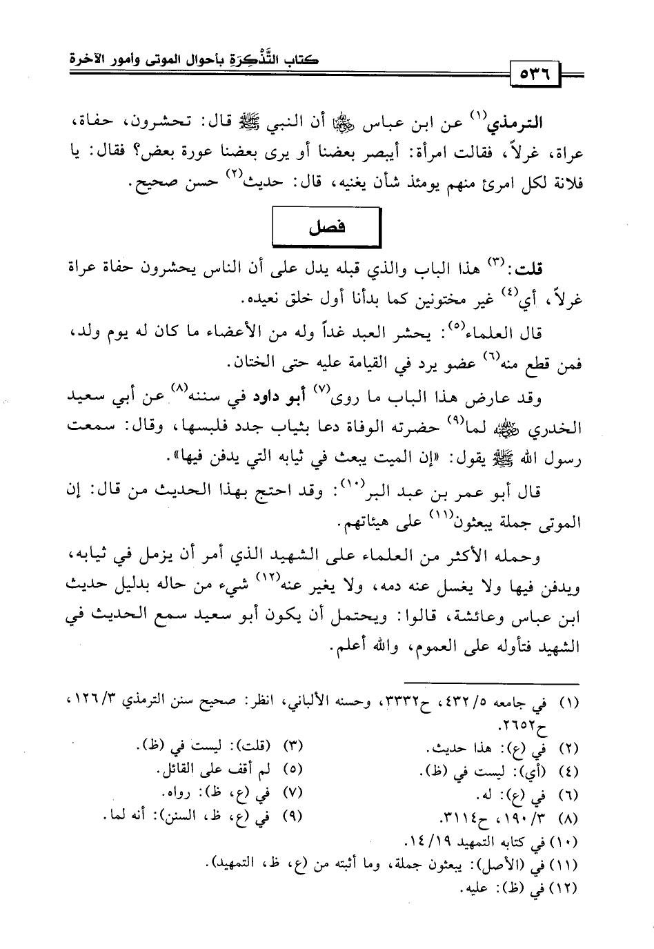 فصل: قلت: هذا الباب والذي قبله يدل على أن الناس يحشرون حفاة عراة غرلاً أي غير مخنوتين كما بدأنا أول خلق نعيده.