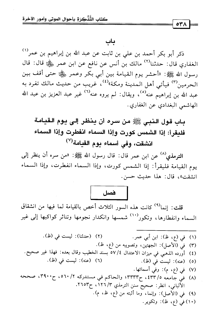الجزء الأول من باب قول النبي صلى الله عليه وسلم من سره أن ينظر إلى يوم القيامة فليقرأ " إذا الشمس كورت " و" إذا السماء انفطرت " و" إذا السماء انشقت " وفي أسماء يوم القيامة