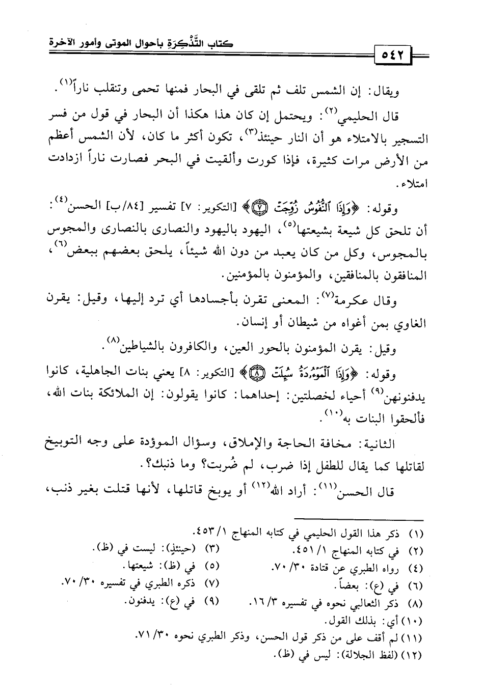 قال الحليمي: ويحتمل إن كان هذا هكذا أن البحار في قول من فسر التسجير بالامتلاء هو أن النار حينئذ تكون أكثرها لأن الشمس أعظم من الأرض مرات كثيرة، فإذا كورت وألقيت في البحر فصارت ناراً ازدادت امتلاء.