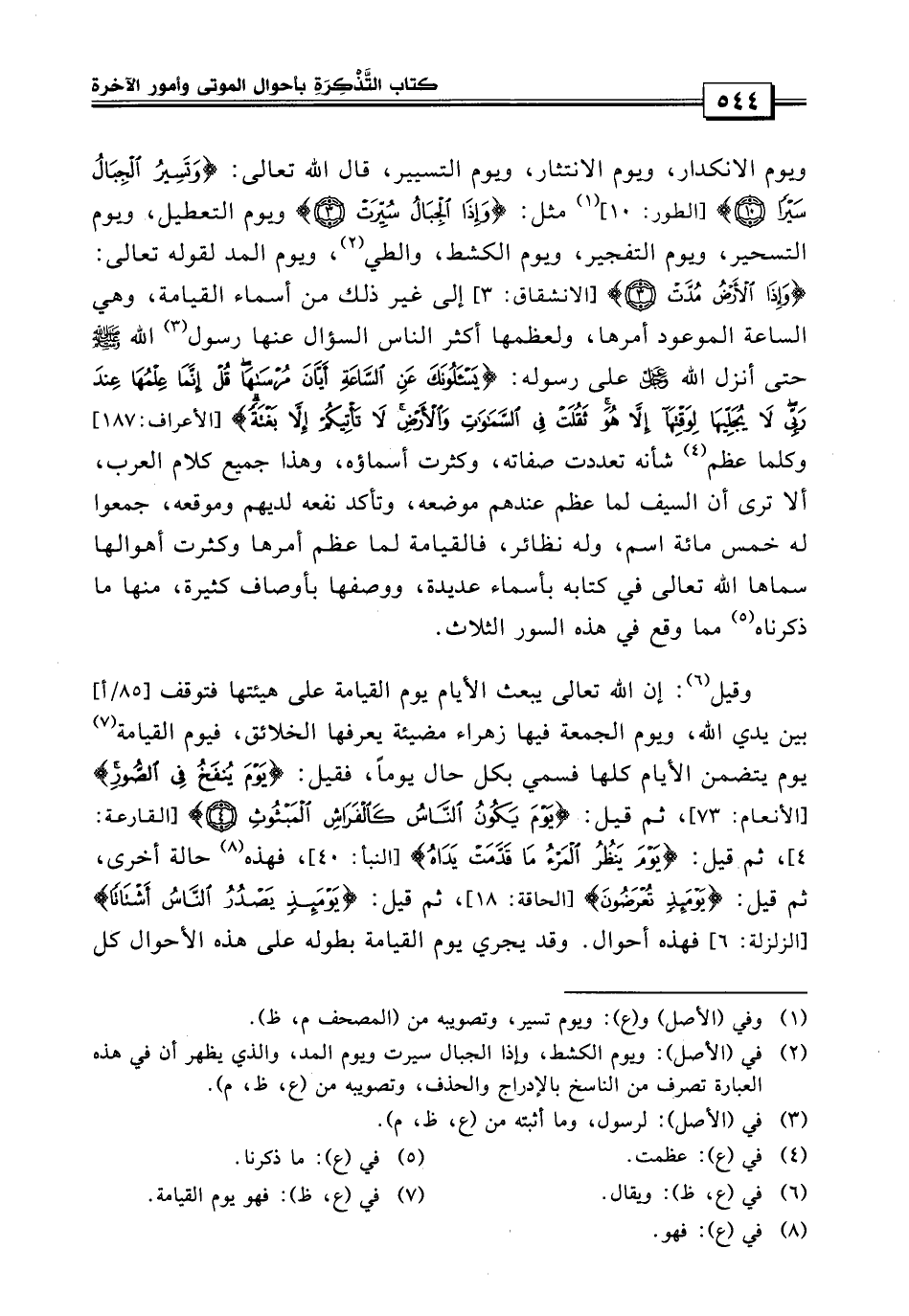 ويوم الانكدار ويوم الانتثار ويوم التسيير قال الله تعالى: {وتسير الجبال سيراً} {وإذا الجبال سيرت} ويوم التعطيل ويوم التسجير ويوم التفجير ويوم الكشط والطي ويوم المد لقوله تعالى: {وإذا الأرض مدت} إلى غير ذلك من أسماء القيامة وهي الساعة الموعود أمرها ولعظمها أكثر الناس السؤال عنها لرسول الله صلى الله عليه وسلم حتى أنزل الله عز وجل على رسوله {يسألونك عن الساعة أيان مرساها قل إنما علمها عند ربي لا يجليها لوقتها إلا هو ثقلت في السماوات والأرض لا تأتيكم إلا بغتةً} وكل ما عظم شأنه تعددت صفاته وكثرت أسماؤه وهذا جميع كلام العرب ألا ترى أن السيف لما عظم عندهم موضعه وتأكد نفعه لديهم وموقعه جمهوا له خمسمائة اسم.