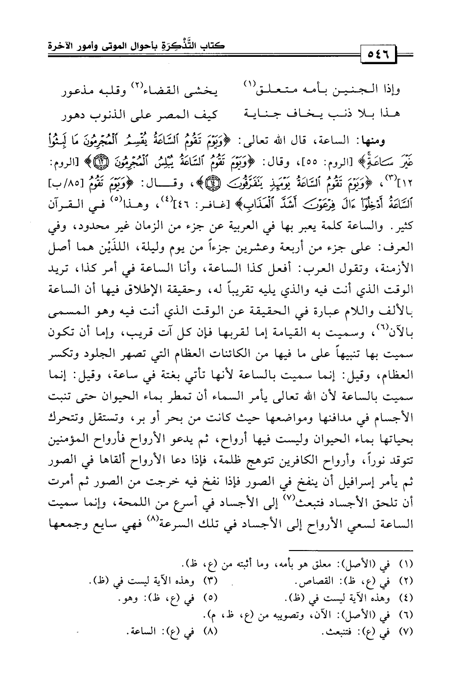 {ويوم تقوم الساعة يومئذ يتفرقون} وقال {ويوم تقوم الساعة أدخلوا آل فرعون أشد العذاب} وهو في القرآن كثير، والساعة كلمة يعبر بها في العربية عن جزء الزمان غير محدود وفي العرف على جزء من أربعة وعشرين جزءاً من يوم وليلة والذين هما أصل الأزمنة، وتقول العرب أفعل كذا الساعة، وأنا الساعة في أمر كذا تريد الوقت الذي أنت فيه، والذي يليه تقريباً له وحقيقة الإطلاق فيها أن الساعة بالألف واللام عبارة في الحقيقة عن الوقت الذي أنت فيه وهو المسمى بالآن وسميت به القيامة إما لقربها فإن كل آت قريب، وإما أن تكون سميت بها تنبيهاً على ما فيها من الكائنات العظام التي تصهر الجلود وتكسر العظام وقيل: إنما سميت بالساعة لأنها تأتي بغتة في ساعة، وقيل: إنما سميت بالساعة لأن الله تعالى يأمر السماء أن تمطر بماء الحيوان حتى تنبت الأجساد في مدافنها ومواضعها حيث كانت من بحر أو بر وتستقل وتتحرك بحياتها بماء الحيوان، وليست فيها أرواح ثم تدعى الأرواح، فأرواح المؤمنين تتوقد نوراً، وأرواح الكافرين تتوهج ظلمة، فإذا دعا الأرواح ألقاها في الصور ثم يأمر إسرافيل أن ينفخ في الصور فإذا نفخ فيه خرجت من الصور ثم أمرت أن تلحق الأجساد فتبعث إلى الأجساد في أسرع من اللمحة، وأنما سميت الساعة لسعي الأرواح إلى الأجساد في تلك السرعة فهي سائغ وجمعها