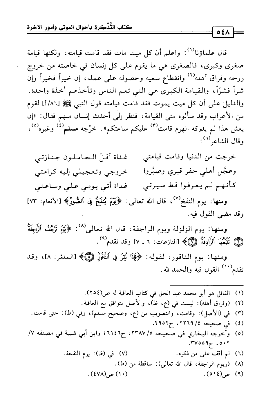 قال علماؤنا: واعلم أن كل ميت مات فقد قيامته، ولكنها قيامة صغرى وكبرى، فالصغرى هي ما يقوم على كل إنسان في خاصته من خروج روحه وفراق أهله وانقطاع سعيه وحصوله على عمله.