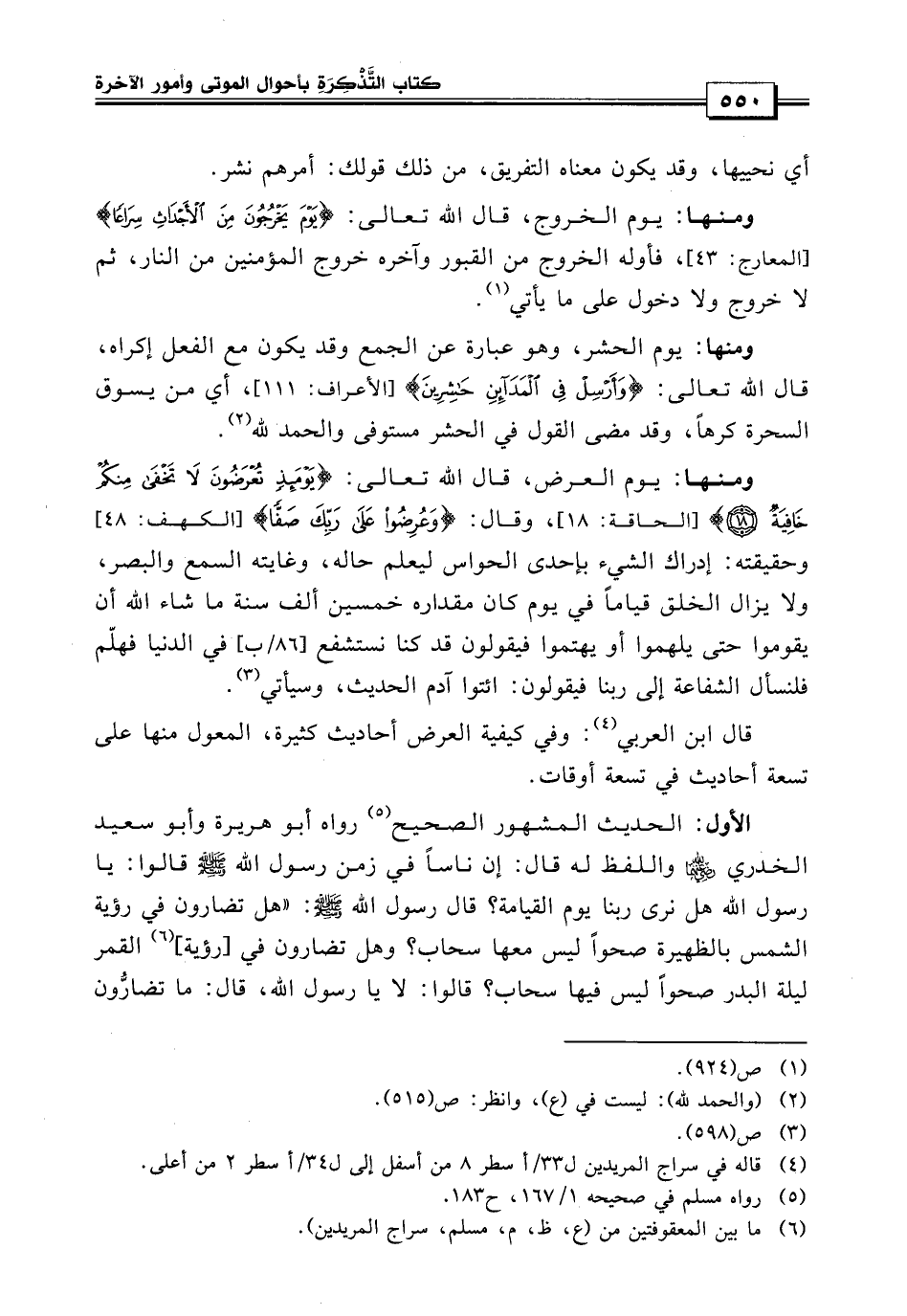 ومنها: يوم العرض قال الله تعالى: {يومئذ تعرضون لا تخفى منكم خافية} وقال: {وعرضوا على ربك صفاً} وحقيقتة إدراك الشيء بإحدى الحواس ليعلم حاله وغايته السمع والبصر فلا يزال الخلق قياماً في يوم كان مقداره خمسين ألف سنة ما شاء الله أن يقوموا حتى يلهموا أو يهتموا.