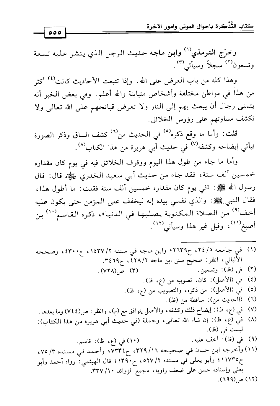قلت: وأما ما وقع ذكره في الحديث من كشف الساق وذكر الصورة فيأتي إيضاحه ذلك وكشفه إن شاء الله في حديث أبي هريرة رضي الله عنه من هذا الكتاب إن شاء الله تعالى.