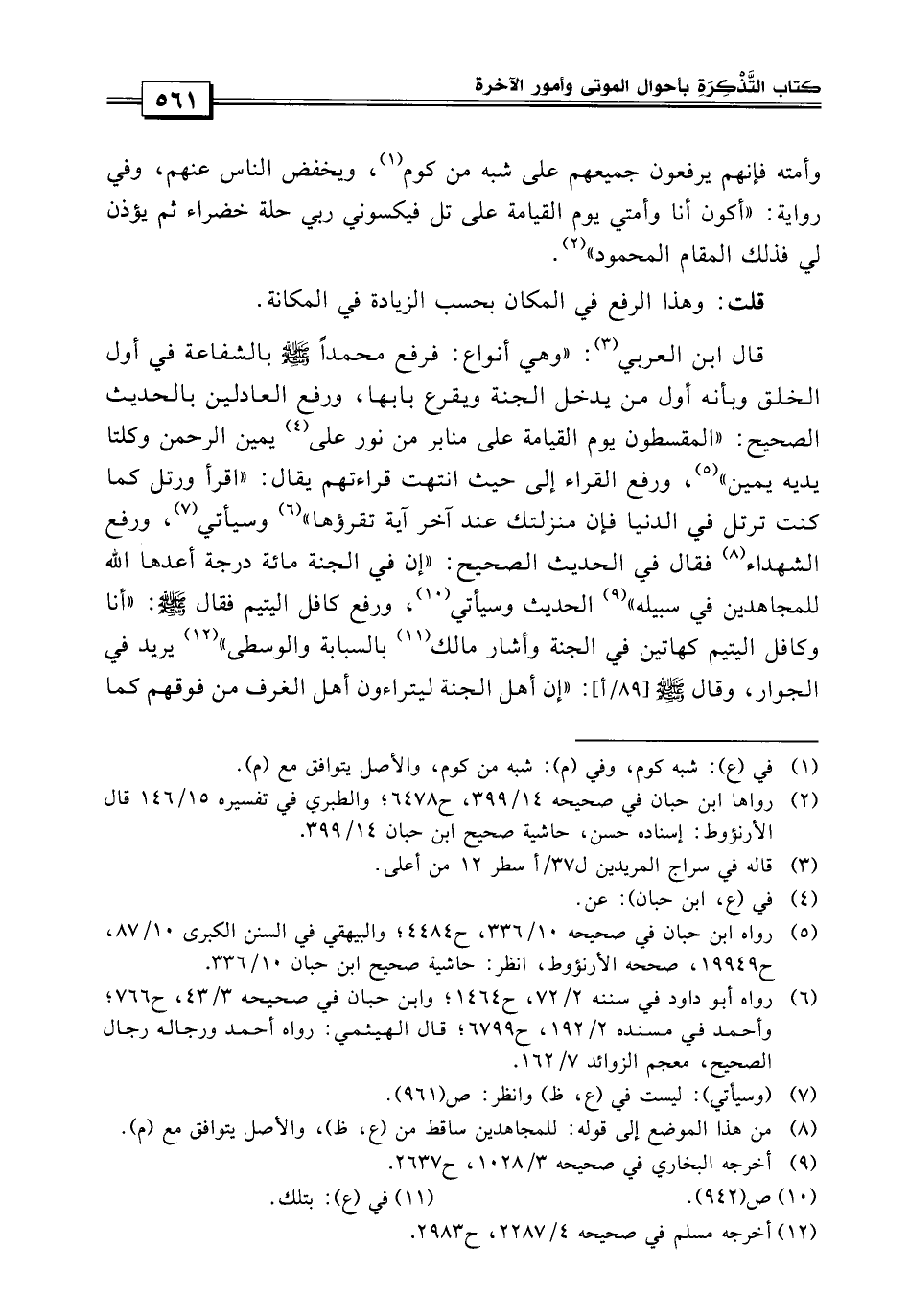 يقال: اقرأ ورتل كما كنت ترتل في الدنيا فإن منزلتك عند آخر آية تقرؤها، وسيأتي ورفع الشهداء فقال في الحديث الصحيح «إن في الجنة مائة درجة أعدها الله للمجاهدين في سبيله» الحديث وسبأتي، ورفع كافل اليتيم فقال صلى الله عليه وسلم «أنا وكافل اليتيم كهاتين في الجنة» وأشار مالك بالسبابة والوسطى يريد في الجوار وقال صلى الله عليه وسلم: «إن أهل الجنة ليتراءون أهل الغرف من فوقهم كما