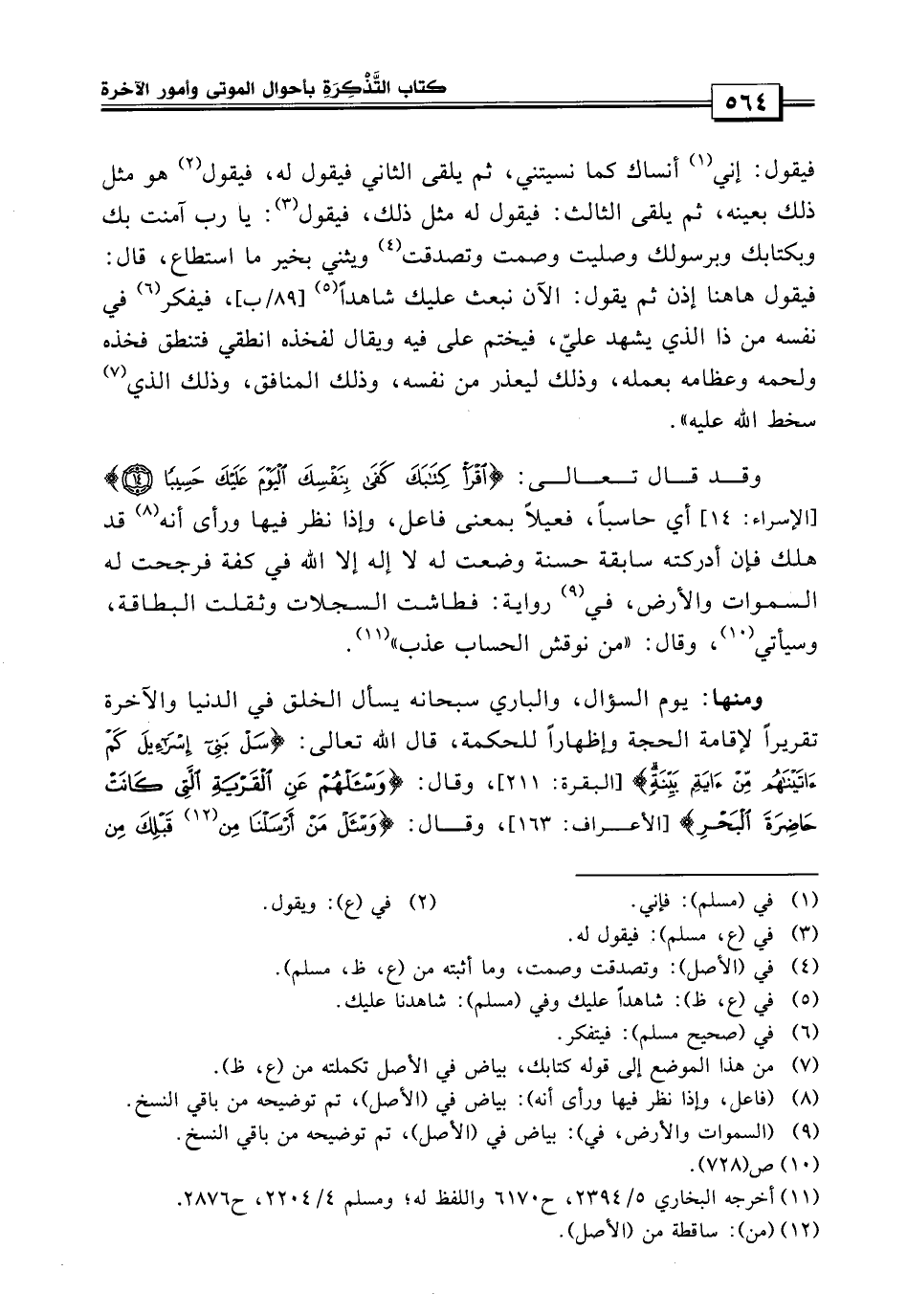 ويقال لفخذه انطقي فتنطق فخذه ولحمه وعظام بعمله وذلك ليعذر من نفسه وذلك المنافق وذلك الذي يسخط الله عليه، وقد قال الله تعالى {اقرأ كتابك كفى بنفسك اليوم عليك حسيباً} أي حاسباً فعيلاً بمعنى فاعل، وإذا نظر فيها ورأى أنه قد هلك فإن أدركته سابقة حسنة وضعت له لا إله إلا الله في كفة فرجحت له السموات والأرض.