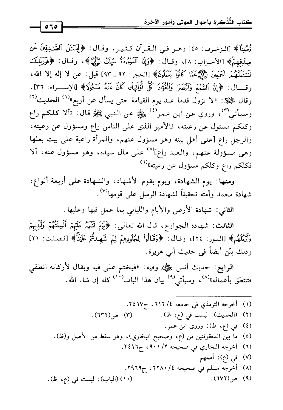 الرابع: حديث أنس رضي الله عنه وفيه ويختم على فيه ويقال لأركانه انطقي فتنطق بأعماله، وسيأتي بيان هذا الباب كله إن شاء الله تعالى.