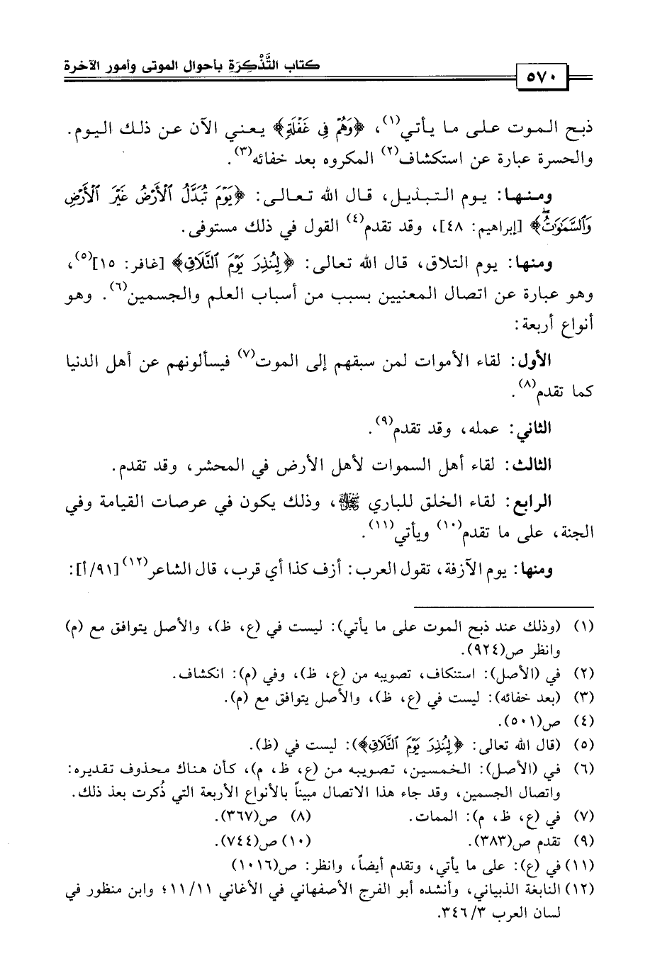 قال الله تعالى: {لينذر يوم التلاق} وهو عبارة عن اتصال المعنيين بسبب من أسباب العلم والجسمين.