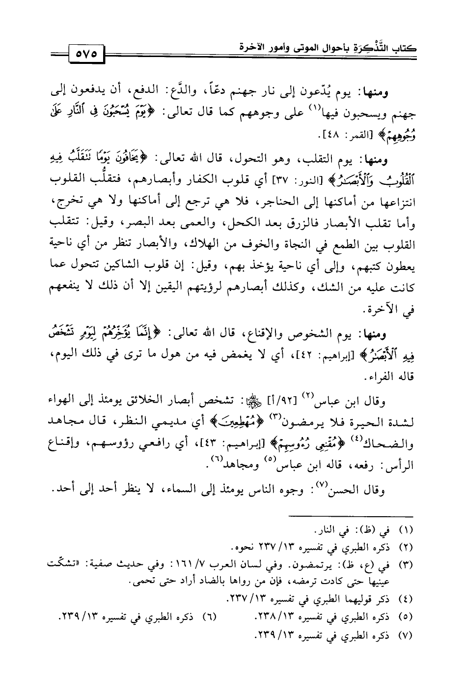 قال الله تعالى: {يخافون يوماً تتقلب فيه القلوب والأبصار} أي قلوب الكفار وأبصارهم فتقلب قلوب الكفار انتزاعها من أماكنها إلى الحناجر فلا هي ترجع إلى أماكنها ولا هي تخرج، فأما تقلب الأبصار فالزرقة بعد الحكل والعمى بعد البصر.