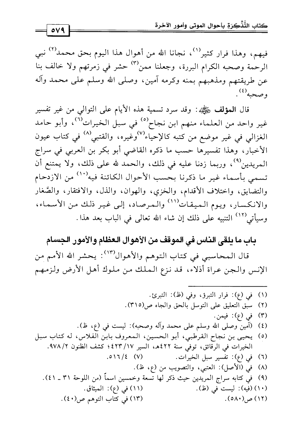 قال المحاسبي في كتاب التوهم والأهوال: يحشر الله الأمم من الإنس والجن عراة أذلاء قد نزع الملك من ملوك الأرض ولزمهم