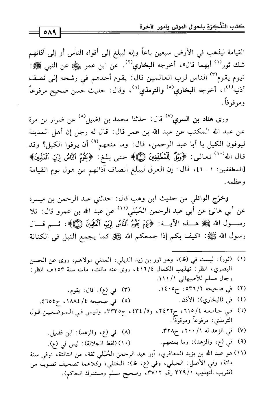 القيامة ليذهب في الأرض سبعين باعاً وإنه ليبلغ إلى أفواه الناس أو آذانهم يشك ثور أيهما» قال: أخرجه البخاري، «وعن ابن عمر رضي الله عنهما، عن النبي صلى الله عليه وسلم {يوم يقوم الناس لرب العالمين} قال: يوم يقوم أحدهم في رشحه إلى نصف أذنيه» أخرجه البخاري والترمذي وقال: حديث صحيح مرفوعاً وموقوفاً.