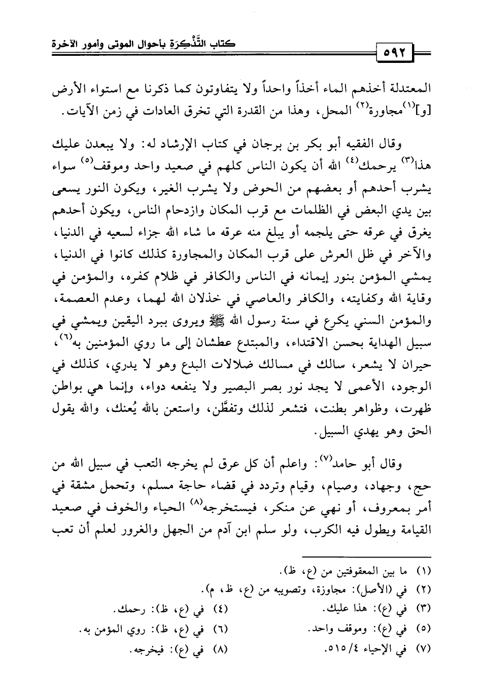 وقال الفقيه أبو بكر بن برجان في كتاب الإرشاد له: ولا يبعدون عليك هذا يرحمك الله أن يكون الناس كلهم في صعيد واحد وموقف سواء يشرب أحدهم أو بعض من الحوض ولا يشرب الغير، ويكون النور يسعى بين يدي البعض في الظلمات مع قرب المكان وازدحام الناس، ويكون أحدهم يغرق في عرقه حتى يلجمه أو يبلغ منه عرقه ما شاء الله جزاء لسعيه في الدنيا والآخرة في ظل العرش على قرب المكان والمجاورة، كذلك كانوا في الدنيا يمشي المؤمن بنور إيمانه في الناس والكافر في ظلام كفره، والمؤمن في وقاية الله وكفايته والكافر والعاصي في خذلان الله لهما وعدم العصمة، والمؤمن السني يكرع في سنة رسول الله صلى الله عليه وسلم، ويروى ببرد اليقين ويمشي في سبل الهداية بحسن الاقتداء والمبتدع عطشان إلى ما روى المؤمن به حيران لا يشعر سالك في مسالك ضلالات البدع وهو لا يدري، كذلك في الوجود الأعمى لا يجد نور بصر البصير ولا ينفعه دواء إنما هي بواطن وظواهر بطنت فتشعر لذلك وتفطن واستعن بالله يعنك، والله يقول الحق وهو يهدي السبيل.