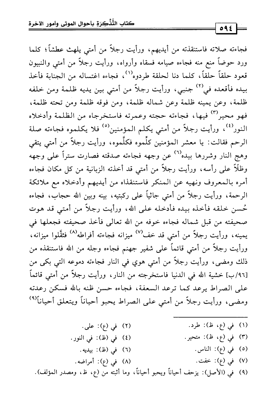 فجاءته صلاته فاستنقذته من أيديهم، ورأيت رجلاً من أمتي يلهث عطشاً كلما ورد حوضاً منع منه فجاءه صيامه فسقاه وأرواه، ورأيت رجلاً من أمتي والنبيون قعود حلقاً حلقاً كلما دنا لحلقة طردوه، فجاء اغتساله من الجنابة فأخذ بيده وأقعده بجنبي، ورأيت رجلاً من أمتي من بين يديه ظلمة ومن خلفه ظلمة وعن يمينه ظلمة وعن شماله ظلمة ومن فوقه ظلمة ومن تحته ظلمة فهو متحير فيها، فجاءته حجته وعمرته فاستخرجاه من الظلمة وأدخلاه في النور، ورأيت رجلاً من أمتي يكلم المؤمنين فلا يكلمونه فجاءته صلة الرحم، فقالت يا معشر المؤمنين كلموه فكلموه، ورأيت رجلاً من أمتي يتقي شرر النار ووهجها بيده عن وجهه فجاءته صدقته فصارت ستراً على وجهه وظلا على رأسه، ورأيت رجلاً من أمتي قد أخذته الزبانية من كل مكان فجاءه أمره بالمعروف ونهيه عن المنكر فاستنفذه من أيديهم وأدخلاه مع ملائكة الرحمة، ورأيت رجلاً من أمتي جانباً على ركبتيه بينه وبين الله حجاب فجاءه حسن خلقه فأخذ بيده فأدخله على الله، ورأيت رجلاً من أمتي قد هوت صحيفة من قبل شماله فجاءه خوفه من الله تعالى فأخذ صحيفته فجعلها في يمينه، ورأيت رجلاً من أمتي قد خف ميزانه فجاءته أفراطه فثقلوا ميزانه، ورأيت رجلاً من أمتي قائماً على شفير جهنم فجاءه وجله من الله فاستنقذه من ذلك ومضى، ورأيت رجلاً من أمتي هوى في النار فجاءته دموعه التي بكى من خشية الله في الدنيا فاستخرجته من النار، ورأيت رجلاً من أمتي قائماً على الصراط يرعد كما ترعد السعفة فجاءه حسن ظنه بالله فسكن رعده ومضى، ورأيت رجلاً من أمتي على الصراط،، يحبو أحيانا ويتعلق أحيانا