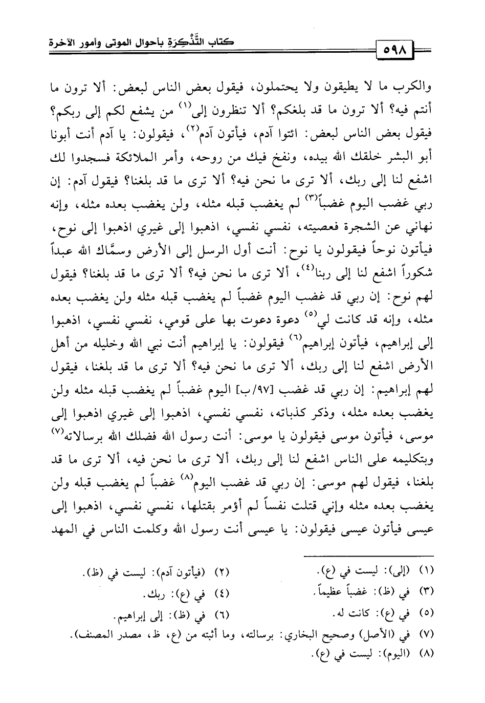 والكرب ما لا يطيقون ولا يحتملون، فيقول بعض الناس لبعض: ألا ترون ما أنتم فيه ألا ترون ما قد بلغكم ألا تنظرون إلى من يشفع لكم إلى ربكم فيقول بعض الناس لبعض: أئتوا آدم فيأتون آدم فيقولون: يا آدم أنت أبونا أبو البشر خلقك الله بيده، ونفخ فيك من روحه، وأمر الملائكة فسجدوا لك اشفع لنا إلى ربك، ألا ترى ما نحن فيه، ألا ترى ما قد بلغنا؟ فيقول آدم: إن ربي قد غضب اليوم غضباً لم يغضب قبله مثله ولن يغضب بعده مثله وإنه نهاني عن الشجرة فعصيته، نفسي نفسي، اذهبوا إلى نوح، فيأتون نوحاً فيقولون: يا نوح أن أول الرسل إلى الأرض وسماك الله عبداً شكوراً، اشفع لنا إلى ربنا، ألا ترى ما نحن فيه ألا ترى ما قد بلغنا؟ فيقول لهم نوح: إن ربي قد غضب اليوم غضباً لم يغضب قبله مثله ولن يغضب بعده مثله، وإنه قد كانت لي دعوة دعوت بها على قومي.