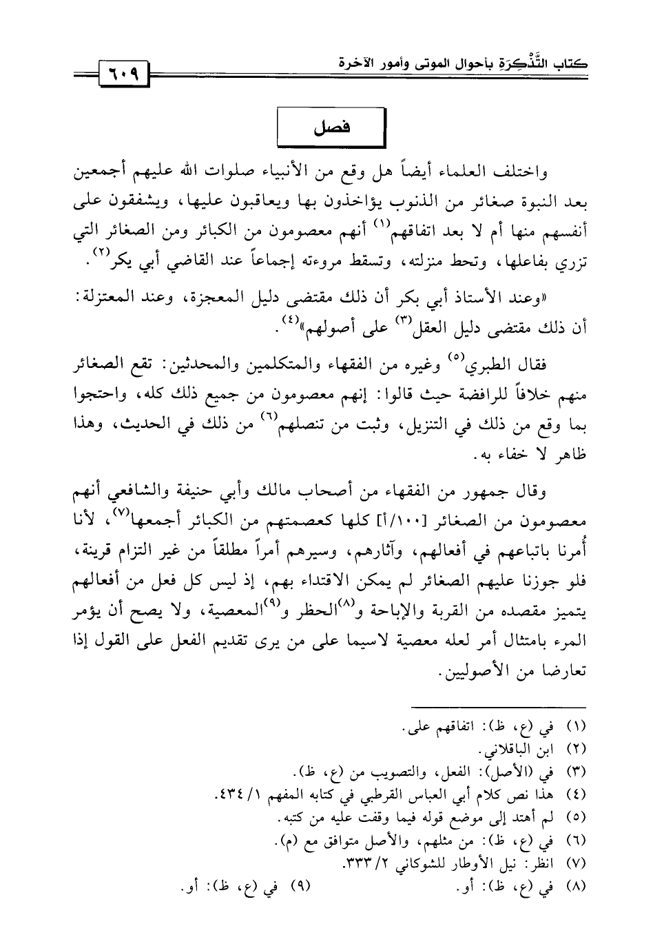فصل: واختلف العلماء هل وقع من الأنبياء صلوات الله عليهم أجمعين بعد النبوة صغائر من الذنوب يؤاخذون بها ويعاتبون عليها ويشفقون على أنفسهم منها أم لا بعد اتفاقهم على أنهم معصومون من الكبائر ومن الصغائر التي تزري بفاعلها وتحط منزلته وتسقط مروءته إجماعاً؟ عند القاضي أبي بكر وعن الأستاذ أبي بكر أن ذلك مقتضى دليل المعجزة وعند المعتزلة أن ذلك مقتضى دليل العقل على أصولهم، فقال الطبري وغيره من الفقهاء والمتكلمين والمحدثين: تقع الصغائر منهم خلافاً للرافضة حيث قالوا إنهم معصومون من جميع ذلك كله، واحتجوا بما وقع من ذلك في التنزيل وثبت من تنصلهم من ذلك في الحديث وهذا ظاهر لا خفاء به.