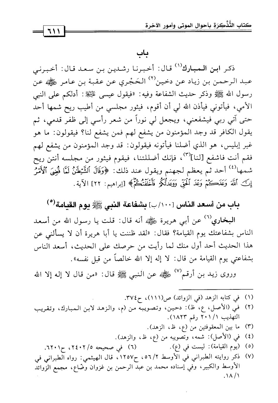 ذكر ابن المبارك قال:» أخبرنا رشدين بن سعد قال: أخبرني عبد الرحمن بن زياد، عن دخين الحجري، عن عقبة بن عامر رضي الله عنه، عن رسول الله صلى الله عليه وسلم، وذكر حديث الشفاعة وفيه فيقول عيسى عليه السلام أدلكم على النبي الأمي فيأتوني فيأذن الله لي أن أقوم فيثور مجلسي أطيب ريح شمها أحد حتى آتي ربي فيشفعني ويجعل لي نوراً من شعر رأسي إلى ظفر قدمي، ثم يقول الكافر قد وجد المؤمنون من يشفع لهم فمن يشفع لنا؟ فيقولون: ما هو غير إبليس هو الذي أضلنا فيأتونه فيقولون قد جد المؤمنون من يشفع لهم فقم أنت فاشفع لنا فإنك قد أضللتنا، فيقوم فيثور من مجلسه أنتن ريح شمه أحد ثم يعظهم لجهنم ويقول عند ذلك {وقال الشيطان لما قضي الأمر إن الله وعدكم وعد الحق ووعدتكم فأخلفتكم} الآية.
