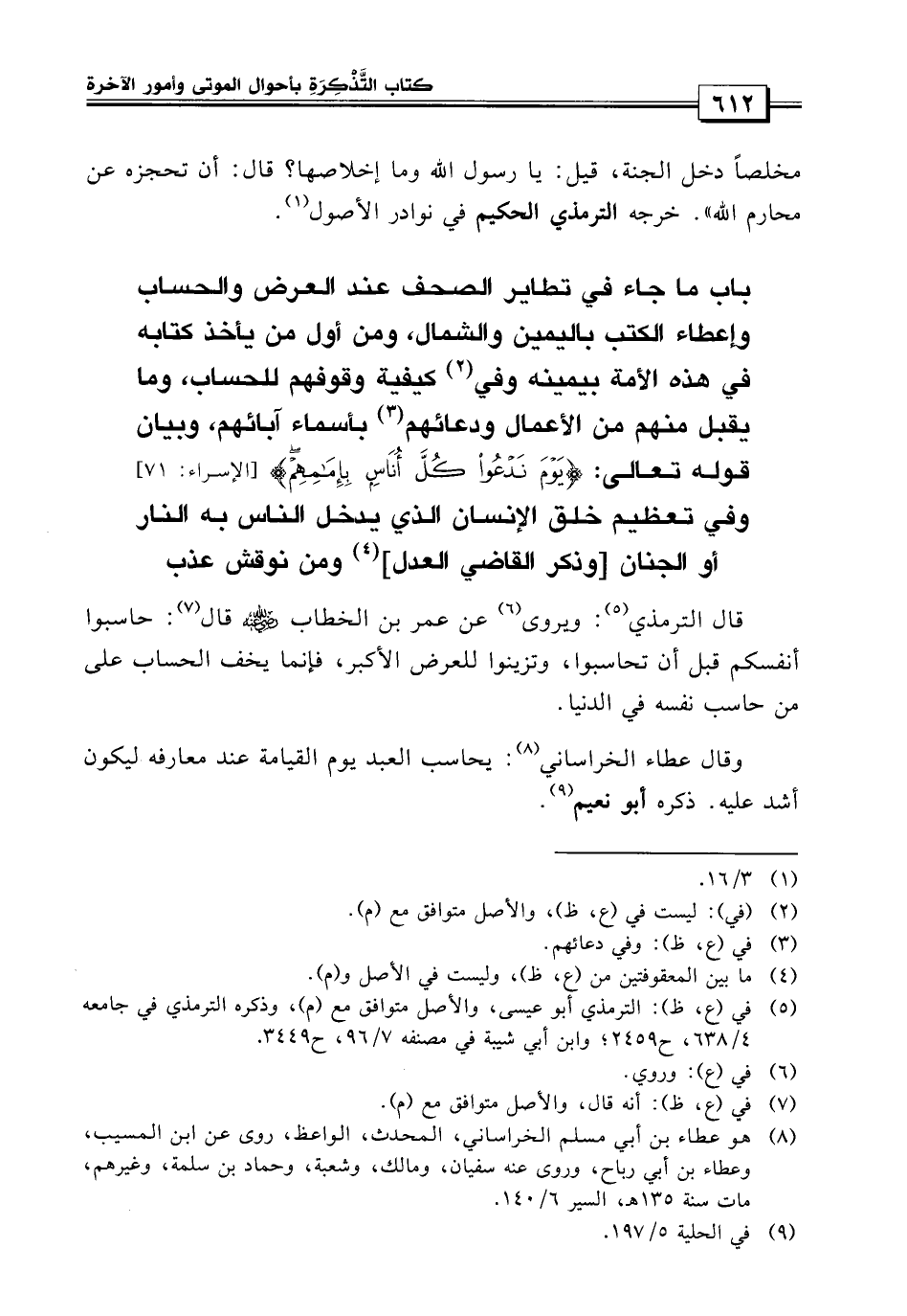 باب ما جاء في تطاير الصحف عند العرض والحساب وإعطاء الكتب باليمين والشمال ومن أول من يأخذ كتابه بيمينه من هذه الأمة، وفي كيفية وقوفهم للحساب وما يقبل منهم من الأعمال، وفي دعائهم بأسماء آباهم وبيان قوله {يوم ندعوا كل أناس بإمامهم} وفي تعظيم خلق الإنسان الذي يدخل الناس به النار أو الجنان وذكر القاضي العدل ومن نوقش عذب.