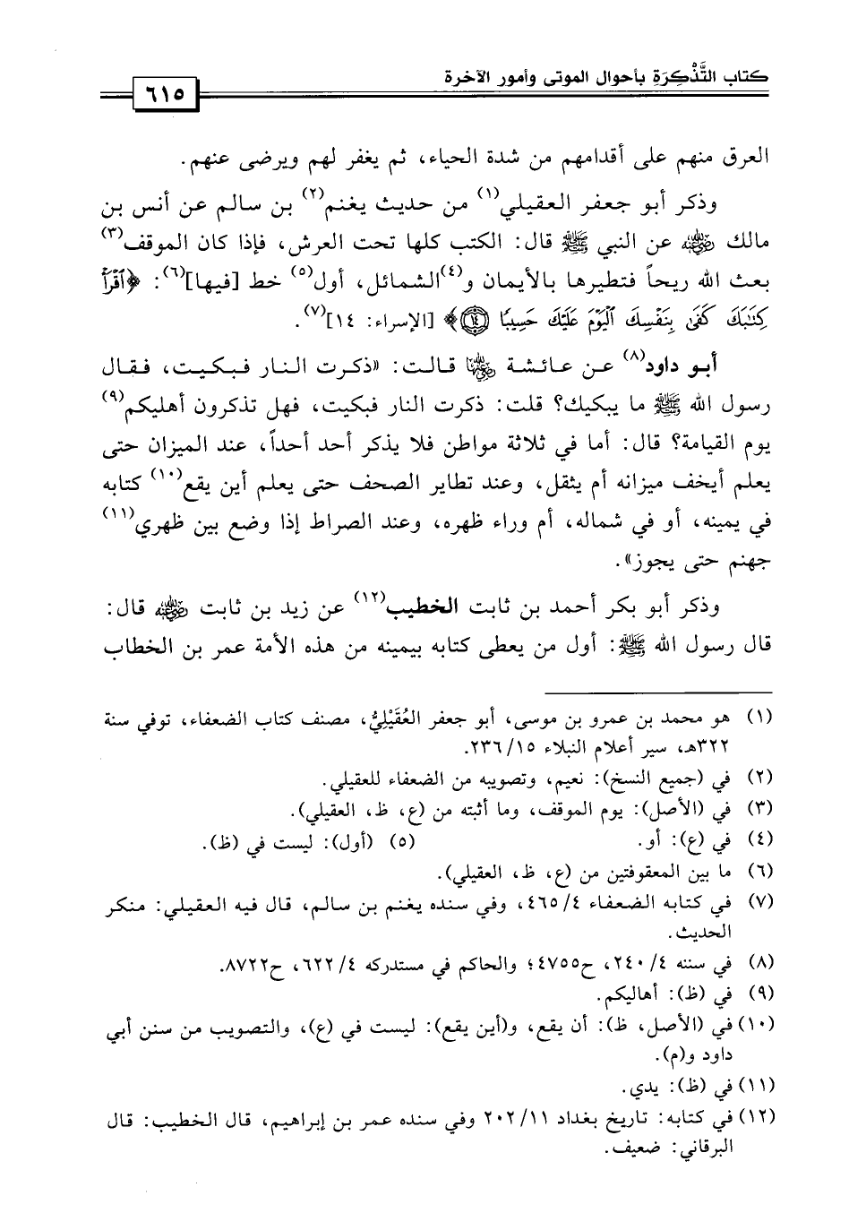 وذكر أبو جعفر العقيلي «من حديث نعيم بن سالم، عن أنس بن مالك رضي الله عنه عن النبي صلى الله عليه وسلم قال: الكتب كلها تحت العرش فإذا كان يوم الموقف بعث الله ريحاً فتطيرها بالإيمان والشمائل أول خط فيها: {اقرأ كتابك كفى بنفسك اليوم عليك حسيباً} » .