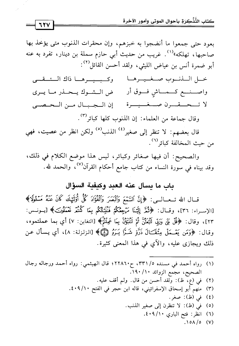 بعود حتى جمعوا ما أنضجوا به خبزهم، وإن محقرات الذنوب متى يؤخذ بها صاحبها تهلكه» غريب من حديث أبي حازم سلمة بن دينار تفرد به عنه أبو ضمرة أنس بن عياض الليثي، ولقد أحسن القائل: