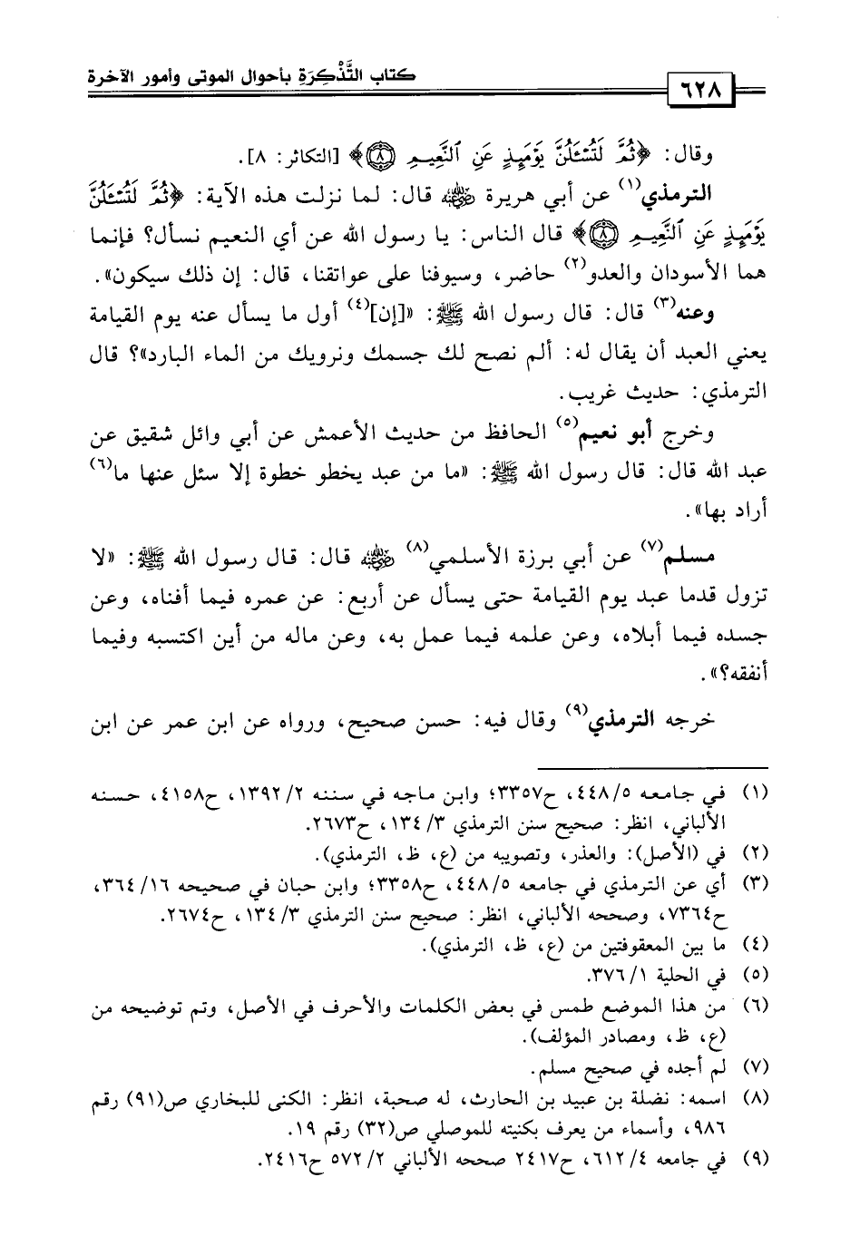 الترمذي «عن أبي هريرة رضي الله عنه قال: لما نزلت هذه الآية {لتسألن يومئذ عن النعيم} قال الناس يا رسول الله: عن أي نعيم نسأل فإنما هما الأسودان والعدو حاضر وسيوفنا على عواتقنا؟ قال: إن ذلك سيكون وعنه قال: قال رسول الله صلى الله عليه وسلم إن أول ما يسأل عنه يوم القيامة يعني العبد أن يقال له ألم أنصح لك جسمك ونرويك من الماء البارد» قال الترمذي: حديث غريب.