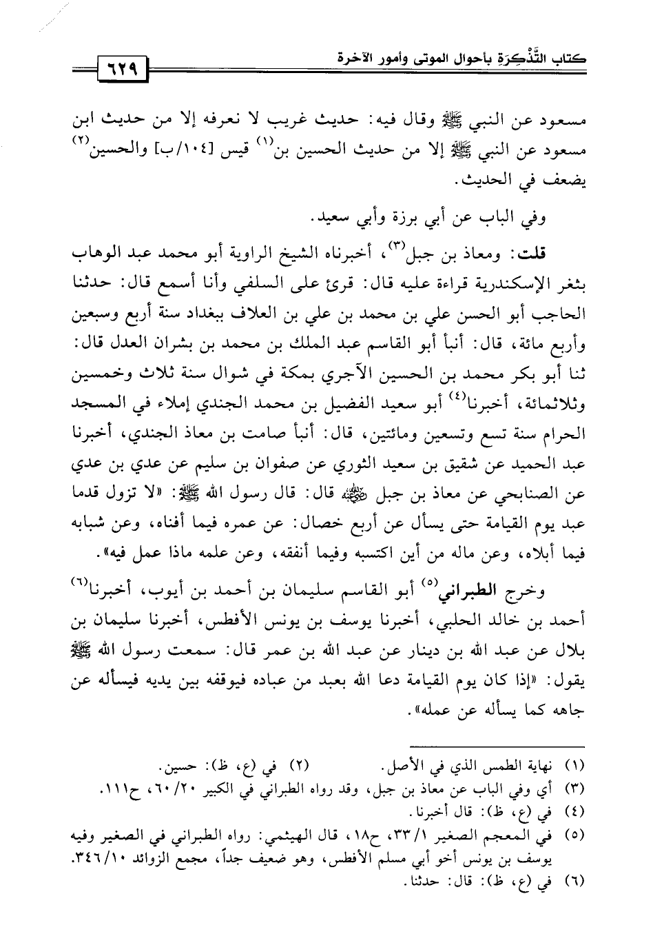 وفي الباب «عن أبي برزة وأبي سعيد، قلت: ومعاذ بن جبل أخبرناه الشيخ الراوية أبو محمد عبد الوهاب بثغر الإسكندرية قراءة عليه، قال: قرأ على البيهقي وأنا أسمع قال: حدثنا الحاجب أبو الحسن علي بن محمد بن علي العلاف ببغداد سنة أربع وسبعين وأربعمائة، قال: أخبرنا أبو القاسم عبد الملك بن محمد بن بشران المعدل، قال: حدثنا أبو بكر محمد بن الحسين الآجري بمكة في شوال سنة ثلاث وخمسين وثلاثمائة قال: أخبرنا أبو سعيد الفضل بن محمد الجندي إملاء في المسجد الحرام سنة تسع وتسعين ومائتين قال: أخبرنا صامت بن معاذ الجندي، أخبرنا عبد الحميد، عن سفيان بن سعيد الثوري، عن صفوان بن سليم، عن عدي بن عدي، عن الصالحي، عن معاذ بن جبل رضي الله عنه قال: قال رسول الله صلى الله عليه وسلم: لا تزول قدما عبد يوم القيامة حتى يسأل عن أربع خصال: عن عمره فيما أفناه؟ وعن شبابه فيما أبلاه؟ وعن ماله من أين اكتسبه؟ وفيما أنفقه؟ وعن عمله ماذا عمل فيه؟» .