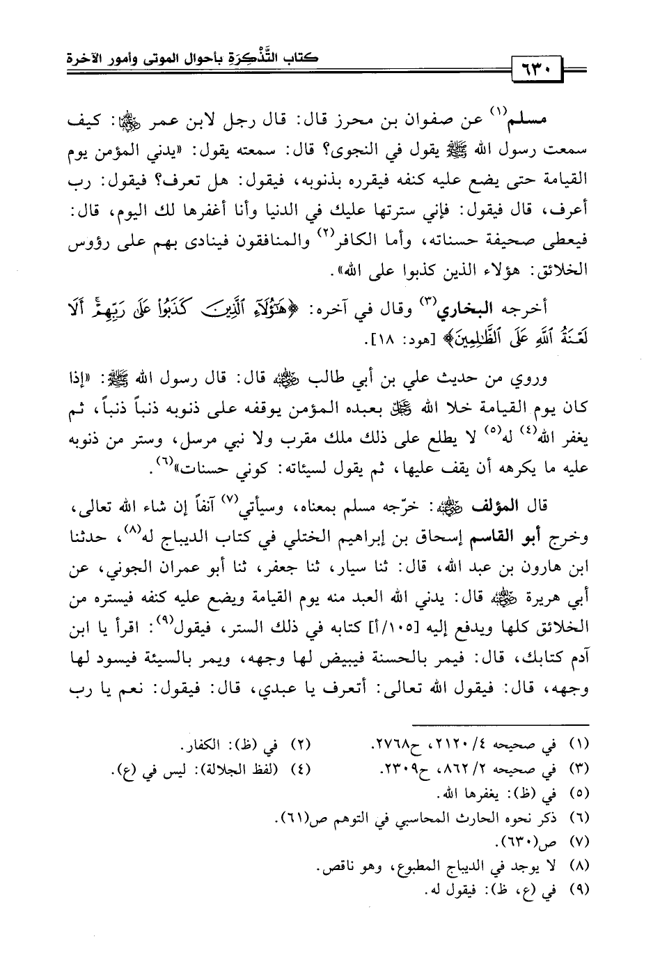 «وروي من حديث علي بن أبي طالب رضي الله عنه قال: قال رسول الله صلى الله عليه وسلم إذا كان يوم القيامة خلا الله عز وجل بعبده المؤمن يوقفه على ذنوبه ذنباً ذنباً، ثم يغفر الله له لا يطلع على ذلك ملك مقرب ولا نبي مرسل وستر عليه من ذنوبه ما يكرهه أن يقف عليها ثم يقول لسيئاته كوني حسنات» .