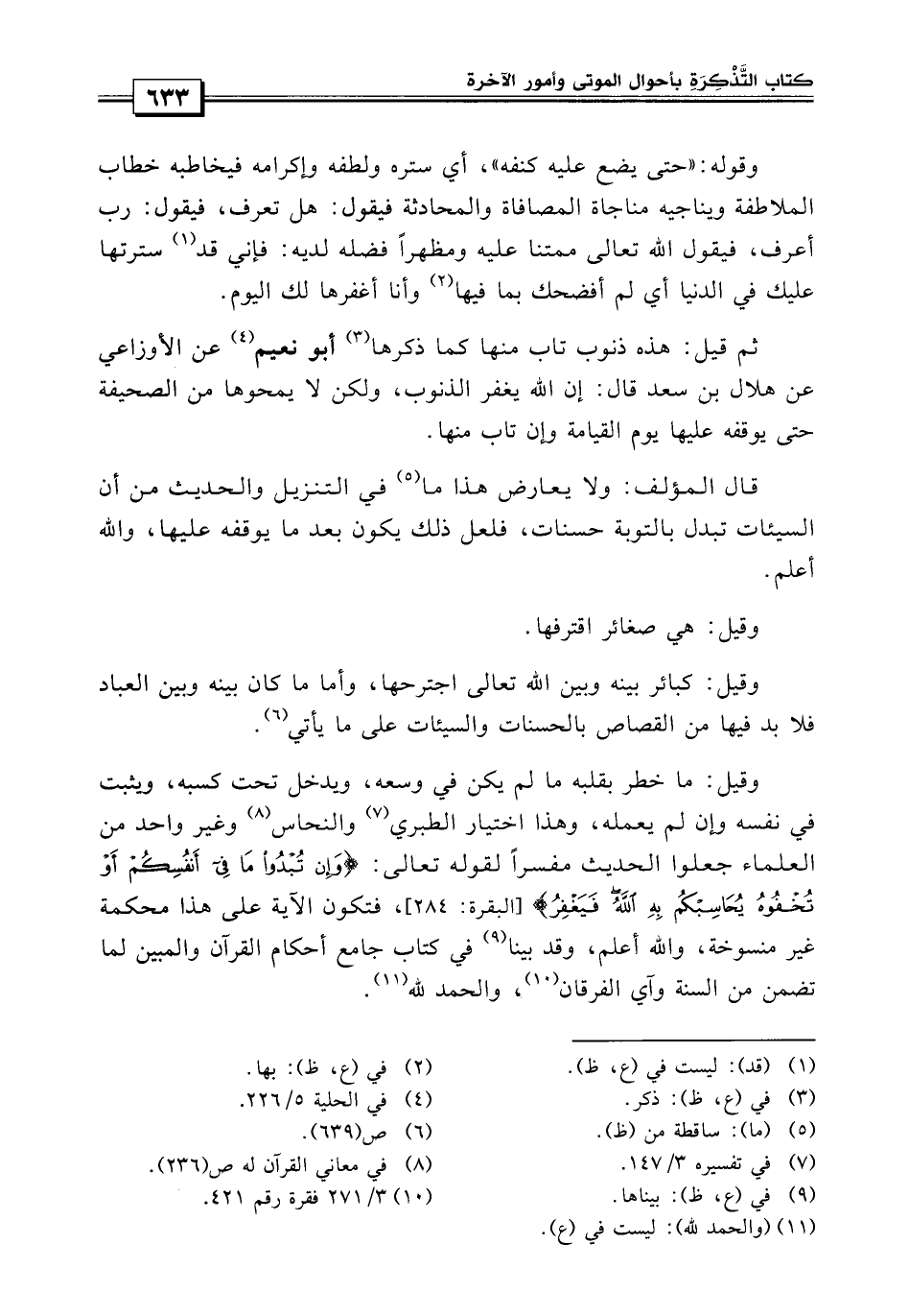 قال المؤلف: ولا يعارض هذا ما في التنزيل والحديث من أن السيئات تبدل بالتوبة حسنات، فلعل ذلك يكون بعد ما يوقفه عليها والله أعلم.