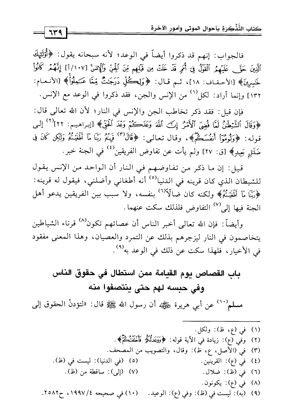 فإن قيل: فقد ذكر يخاطب الجن والإنس في النار لأن الله تعالى قال: {وقال الشيطان لما قضي الأمر إن الله وعدكم وعد الحق} إلى قوله {ولوموا أنفسكم} {قال قرينه ربنا ما أطغيته ولكن كان في ضلال بعيد} ولم يأت عن تفاوض الفريقين في الجنة خبر، قيل: إنما ذكر من تفاوضهم في النار أن الواحد من الإنس يقول للشيطان الذي كان قرينه في الدينا إنه أطغاني وأضلني فيقول له قرينه: ربنا ما أطغيته ولكنه كان ضالاً بنفسه ولا سبب بين الفريقين يدعو أهل الجنة فيهما إلى التفاوض فلذلك سكت عنهما، وأيضاً فإن الله تعالى أخبر الناس أن عصاتهم يكونون قرناء الشياطين يتخاصمون في النار ليزجرهم بذلك عن التمرد والعصيان، وهذا المعنى مقصود في الأخبار، فلهذا سكت عن ذلك في الوعد به.