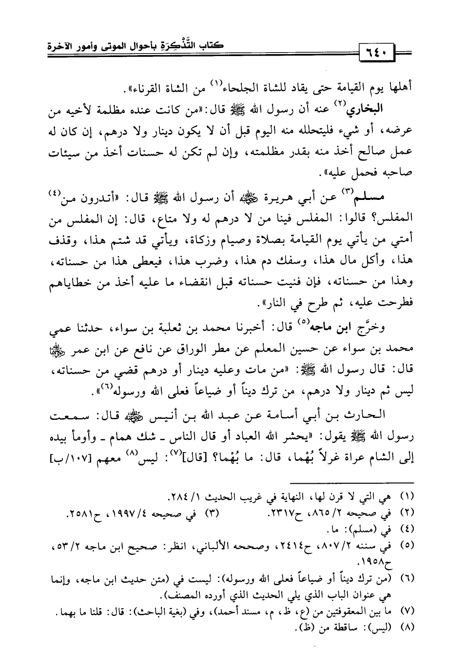 مسلم «عن أبي هريرة رضي الله عنه أن رسول الله صلى الله عليه وسلم قال: أتدرون من المفلس؟ قالوا: المفلس من لا درهم له ولا متاع.