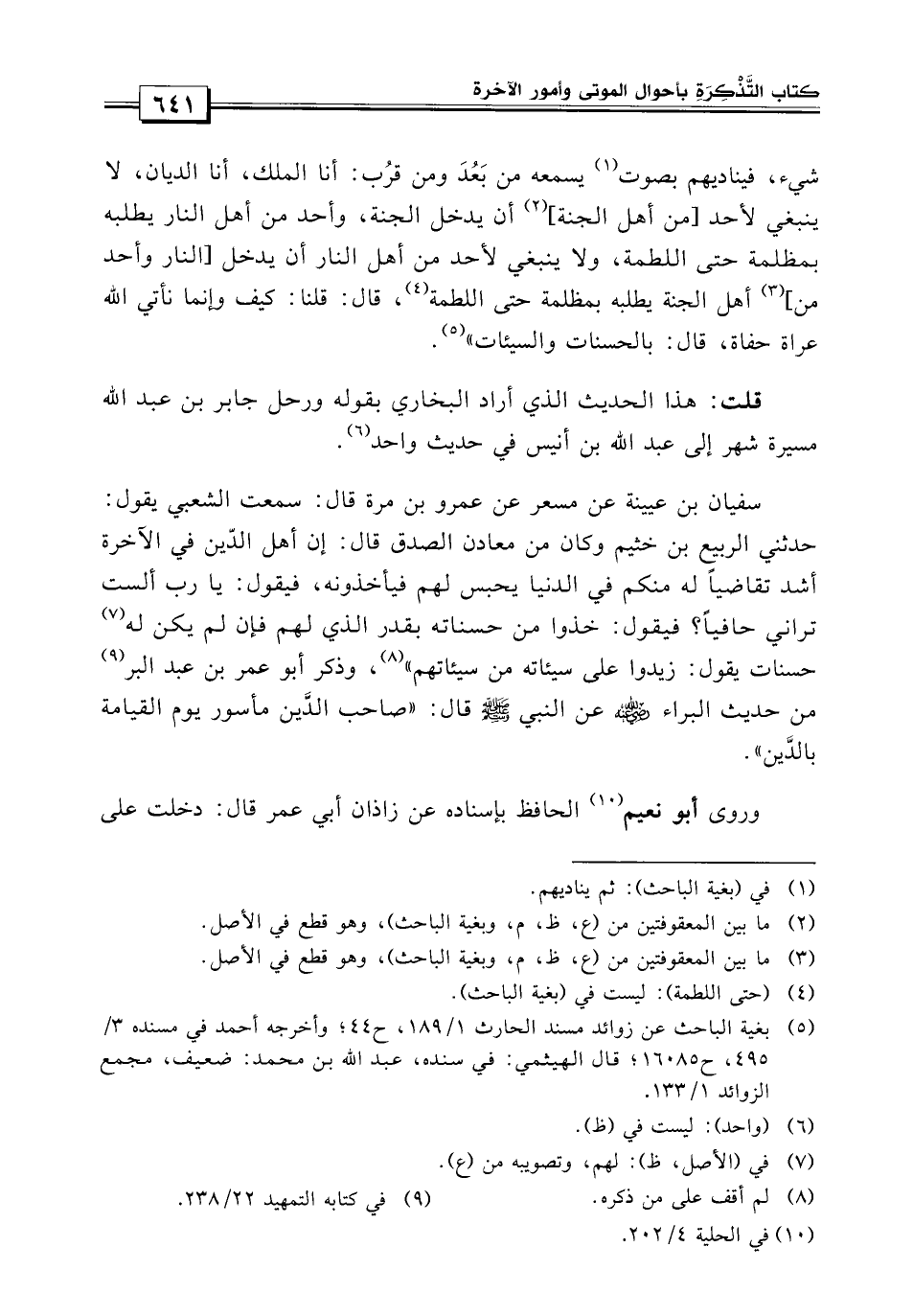سفيان بن عيينة، عن مسعر عن عمرو بن مرة قال: سمعت الشعبي يقول: حدثني الربيع بن خيثم وكان من معادن الصدق قال: إن أهل الدين في الآخرة أشد تقاضياً له منكم في الدنيا يحبس لهم فيأخذونه، فيقول: يا رب ألست تراني حافياً؟ فيقول: خذوا من حسناته بقدر الذي لهم فإن لم يكن له حسنات يقول: زيدوا على سيئاته من سيئاتهم، وذكر أبو عمر بن عبد البر من «حديث البراء رضي الله عنه عن النبي صلى الله عليه وسلم قال: صاحب الدين مأسور يوم القيامة بالدين» .