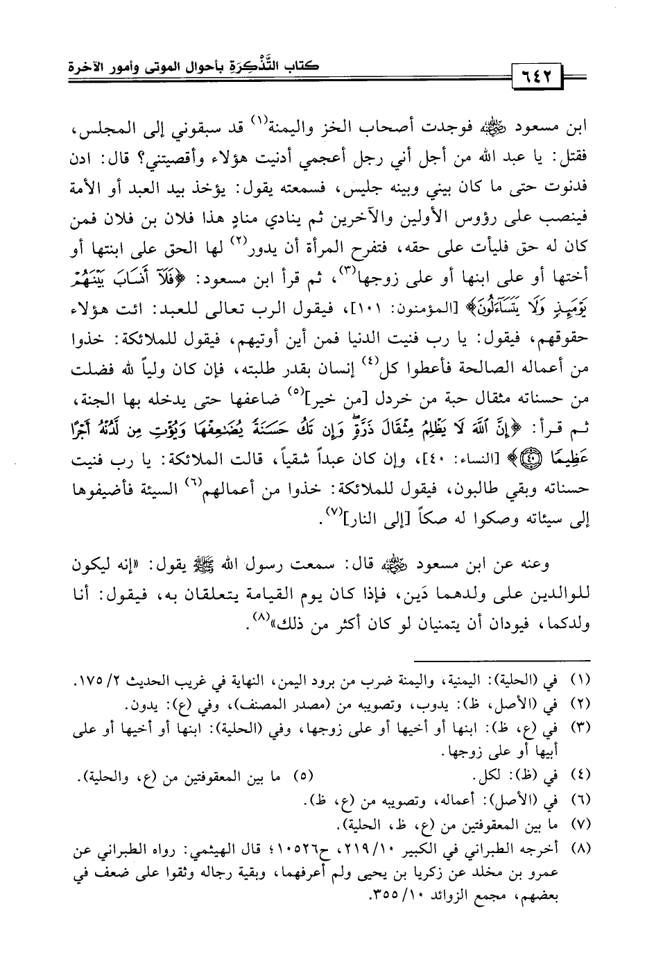 ابن مسعود فوجدت أصحاب الخز واليمنة قد سبقوني إلى المجلس، فقلت يا عبد الله من أجل أبي رجل أعجمي أدنيت هؤلاء وأقصيتني، قال: ادن فدنوت حتى ما كان بيني وبينه جليس فسمعته يقول: يؤخذ بيد العبد أو الأمة فينصب على رؤوس الأولين والآخرين، ثم ينادي مناد هذا فلان ابن فلان فمن كان له حق فليأت إلى حقه، فتفرح المرأة بأن يدون لها الحق على ابنها أو أختها أو أبيها أو على زوجها، ثم قرأ ابن مسعود {فلا أنساب بينهم يومئذ ولا يتساءلون} ، فيقول الرب تعالى للعبد: ائت هؤلاء حقهم، فيقول: يا رب فنيت الدنيا فمن أين أوتيهم؟ فيقول للملائكة: خذوا من أعماله الصالحة فأعطوا كل إنسان بقدر طلبته، فإن كان ولياً لله فضلت من حسناته مثقال حبة من خردل من خبر ضاعفها حتى يدخله بها الجنة ثم قرأ {إن الله لا يظلم مثقال ذرة وإن تك حسنة يضاعفها ويؤت من لدنه أجراً عظيماً} وإن كان عبداً شقياً قالت الملائكة رب فنيت حسناته وبقي طالبون فيقول للملائكة: خذوا من أعمالهم السيئة فأضيفوها إلى سيئاته وصكوا له صكاً إلى النار.