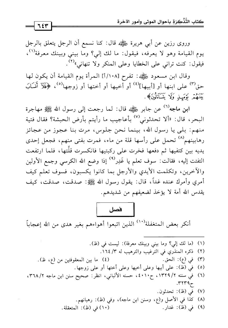 فصل: أنكر بعض المتغفلة الذين اتبعوا أهواءهم بغير هدى من الله إعجاباً