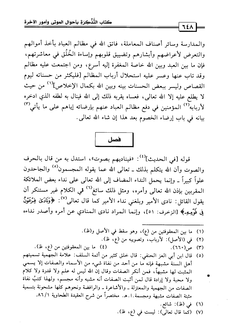 فصل: قوله في الحديث: فيناديهم بصوت استدل به مكن قال بالحرف والصوت.