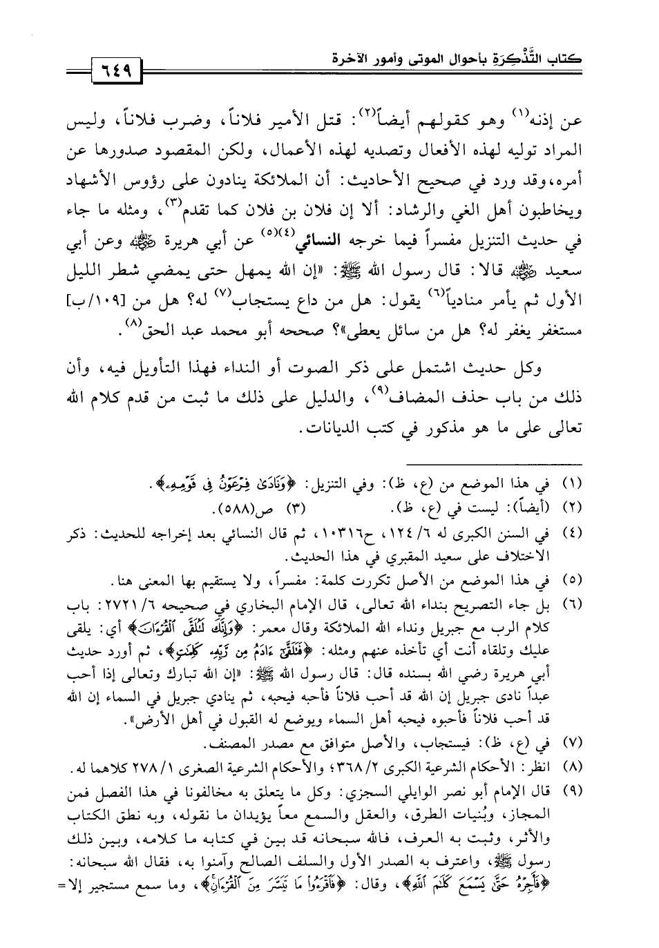 ومثله ما جاء في حديث التنزيل مفسراً فيما أخرجه النسائي «عن أبي هريرة رضي الله عنه وأبي سعيد قالا: قال رسول الله صلى الله عليه وسلم إن الله عز وجل يمهل حتى يمضي شطر الليل الأول ثم يأمر منادياً يقول: هل من داع يستجاب له؟ هل من مستغفر يغفر له؟ هل من سائل يعطى؟» صححه أبو محمد عبد الحق، وكل حديث اشتمل على ذكر الصوت أو النداء، فهذا التأويل فيه وأن ذلك من باب حذف المضاف.