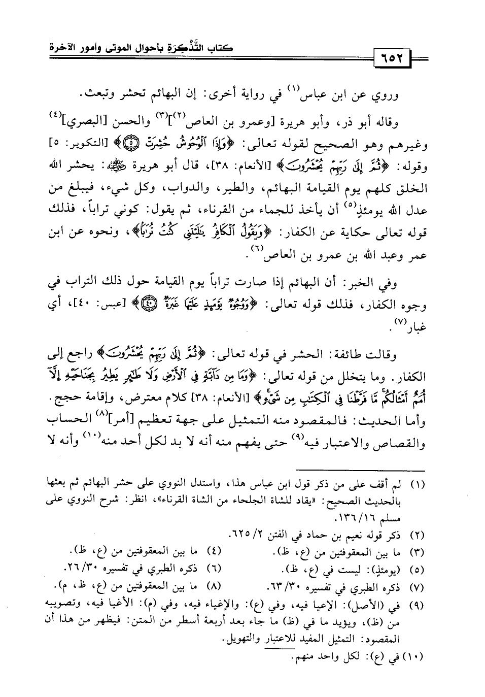 وروي عن ابن عباس في رواية أخرى: أن البهائم تحشر وتبعث قال أبو ذر، وأبو هريرة، وعمرو بن العاص، والحسن البصري وغيرهم وهو الصحيح لقوله تعالى: {وإذا الوحوش حشرت} وقوله {ثم إلى ربهم يحشرون} ، قال أبو هريرة: يحشر الله الخلق كلهم يوم القيامة البهائم والطير والدواب وكل شيء فيبلغ من عدل الله أن يأخذ للجماء من القرناء، ثم يقول: كوني تراباً فذلك قوله تعالى حكاية عن الكفار {ويقول الكافر يا ليتني كنت ترابا} ونحوه عن ابن عمر وعبد الله بن عمرو بن العاص، وفي الخبر: إن البهائم إذا صارت تراباً يوم القيامة حول ذلك التراب في وجوه الكفار، فذلك قوله تعالى {وجوه يومئذ عليها غبرة} أي غبار وقالت طائفة: الحشر في قوله تعالى {ثم إلى ربهم يحشرون} راجع الكفار.