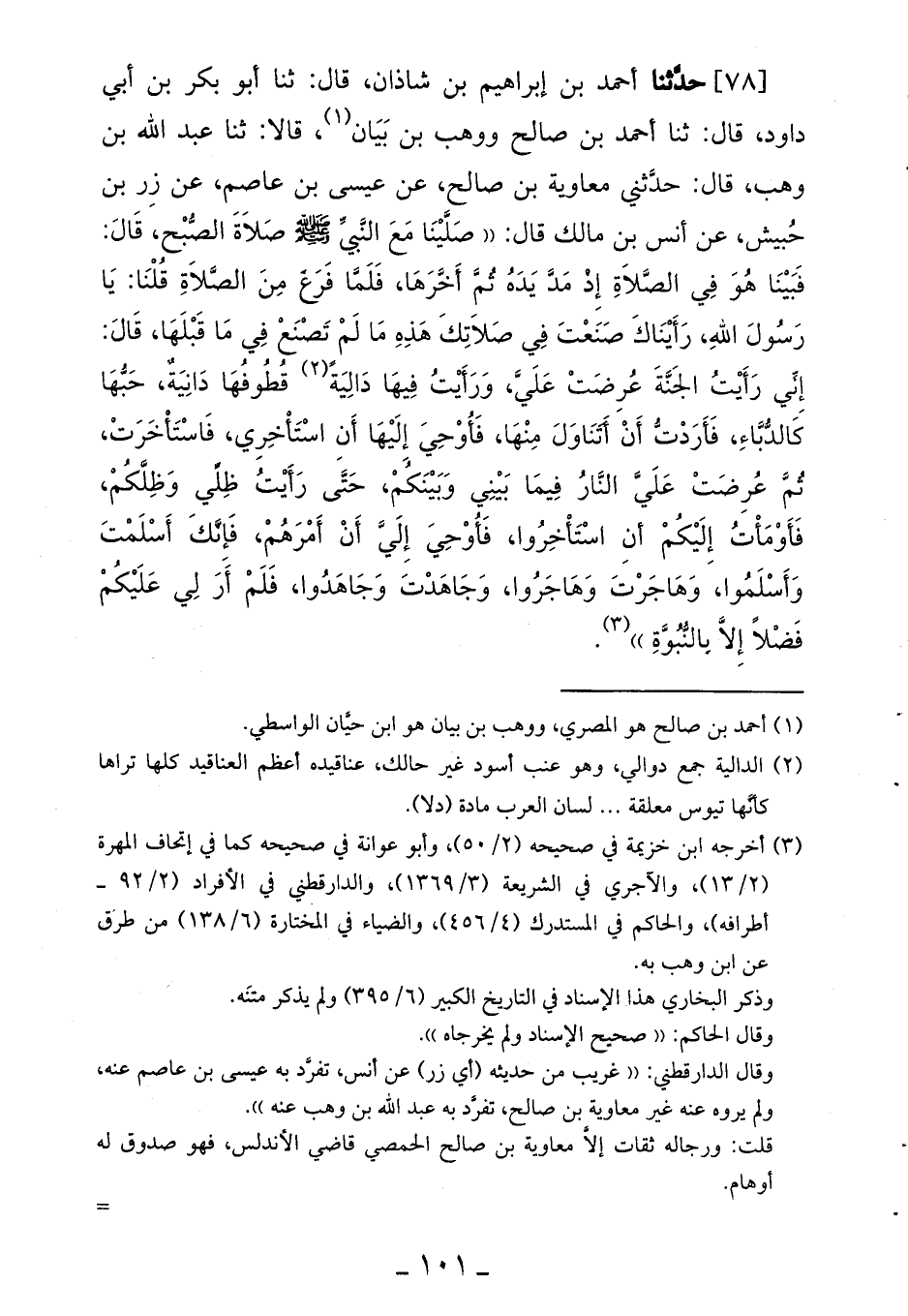 78- حدثنا أحمد بن إبراهيم بن شاذان قال: حدثنا أبو بكر بن أبي داود قال: حدثنا أحمد بن صالح ووهب بن بيان قالا حدثنا عبد الله بن وهب قال: حدثني معاوية بن صالح عن عيسى بن عاصم عن زر بن حبيش عن أنس بن مالك: قال صلينا مع النبي صلى الله عليه وسلم صلاة الصبح قال فبينا هو في الصلاة إذ مد يده ثم أخرها فلما فرغ من الصلاة قلنا يا رسول الله رأيناك صنعت في صلاتك هذه ما لم تصنع في ما قبلها قال إني رأيت الجنة عرضت علي ورأيت فيها دالية قطوفها دانية حبها كالدباء فأردت أن أتناول منها فأوحي إليها أن استأخري فاستأخرت ثم عرضت علي النار فيما بيني وبينكم حتى رأيت ظلي وظلكم فأومأت إليكم أن استأخروا فأوحي إلي أن أمرهم فإنك أسلمت وأسلموا وهاجرت وهاجروا وجاهدت وجاهدوا فلم أر لي عليكم فضلا إلا بالنبوة.